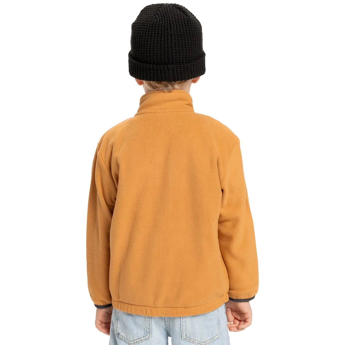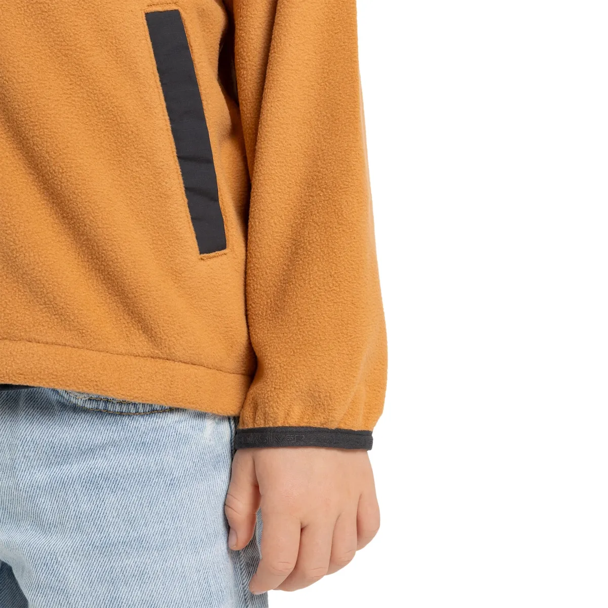 Детская флисовая куртка на молнии. Характеристики включают: Ткань: переработанный полиэстер, 190 г/м², Крой: удобная посадка, Карманы: боковые карманы и накладной карман на груди, Детали Quiksilver на кармане груди и комплект этикеток Quiksilver.