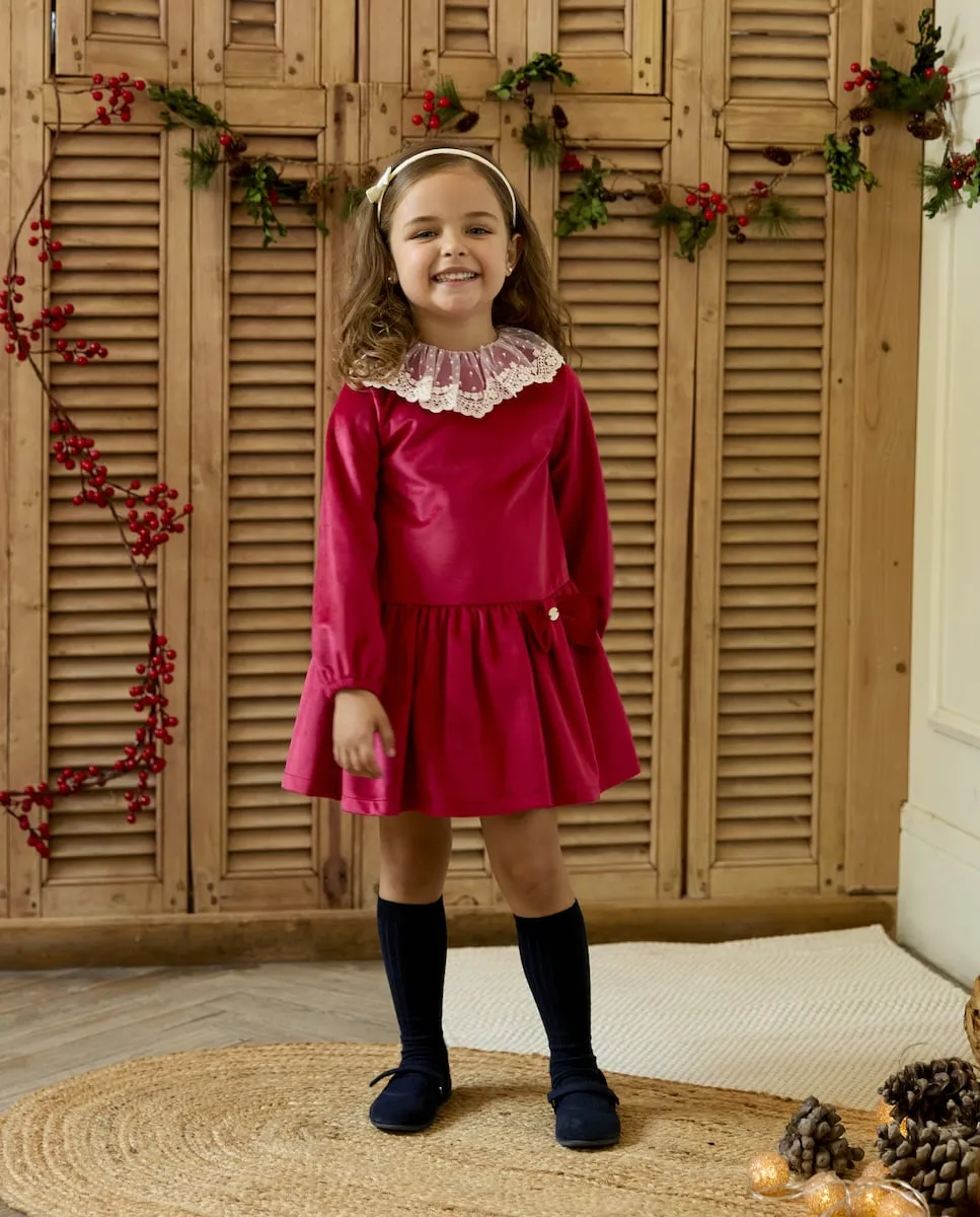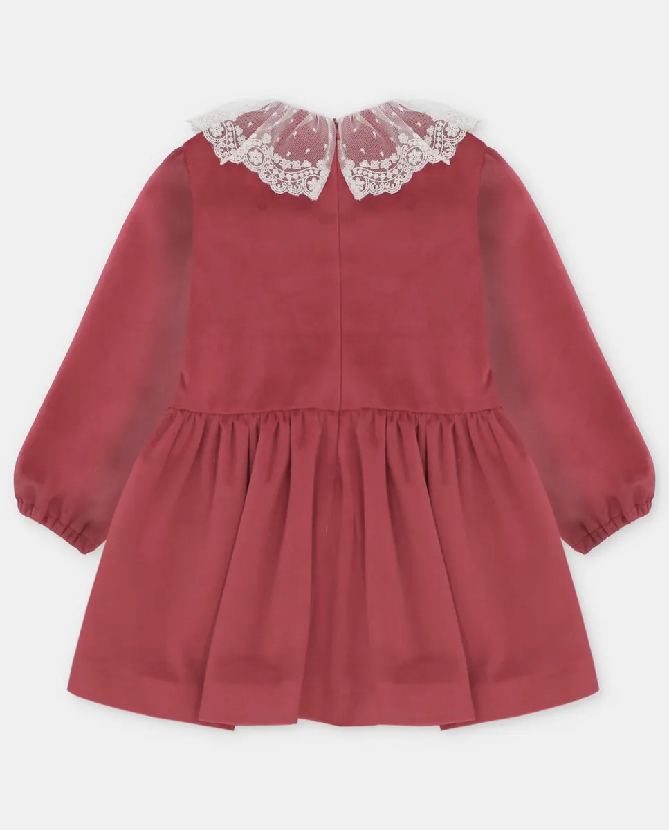 Вельветовое платье для девочки, с отделкой в виде оборчатого воротника и вышитого тюля, сзади застегивается на невидимую молнию того же цвета, велюровый бантик с овалной декоративной пластинкой, красного цвета. Выполнено из 100% полиэстера. Сделано в Испании.