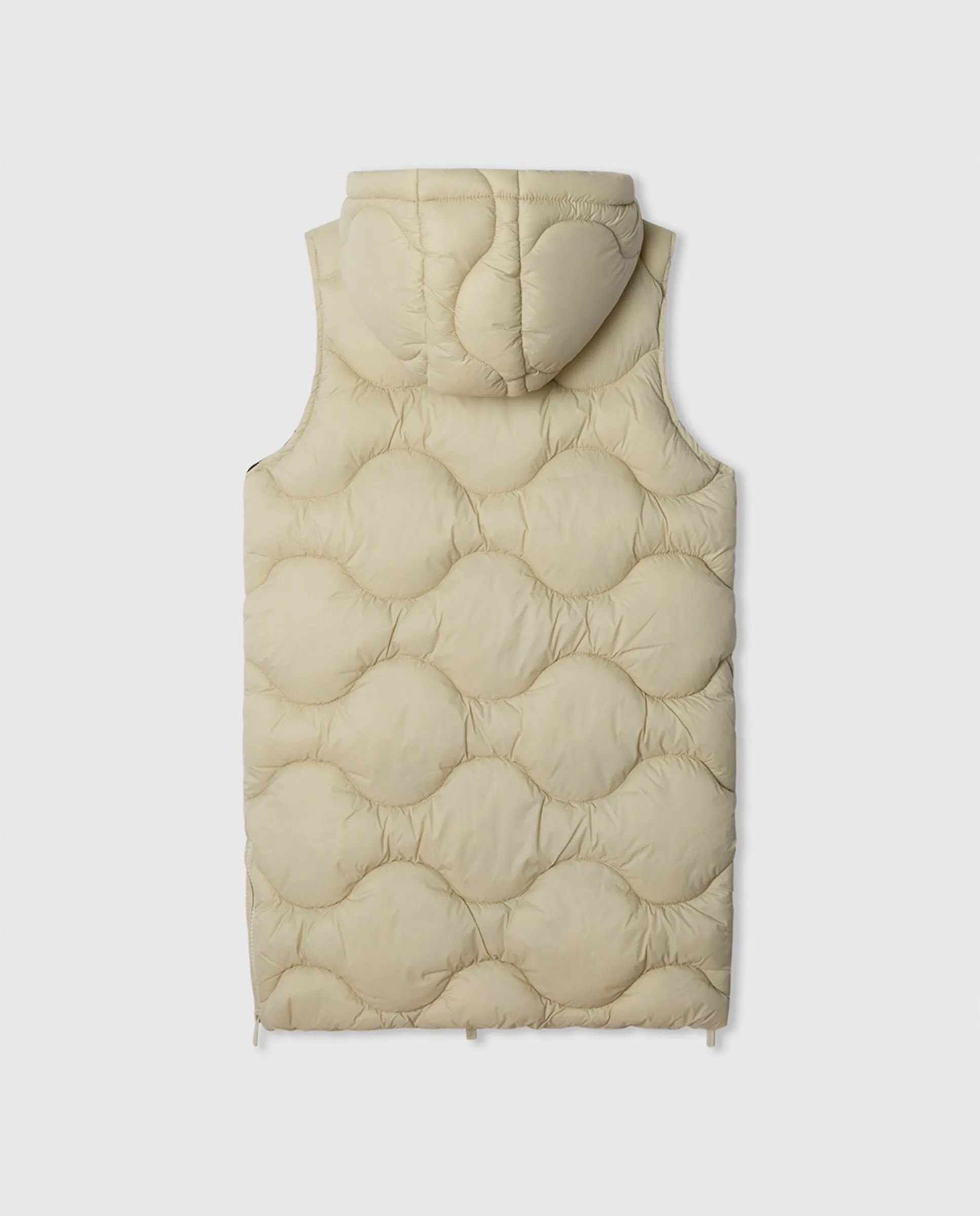Длинный стеганый жилет с двухсторонней застежкой-молнией спереди и боковыми молниями, декоративной резиновой нашивкой на передней части, контрастной подкладкой внутри и боковыми карманами с флисовой подкладкой