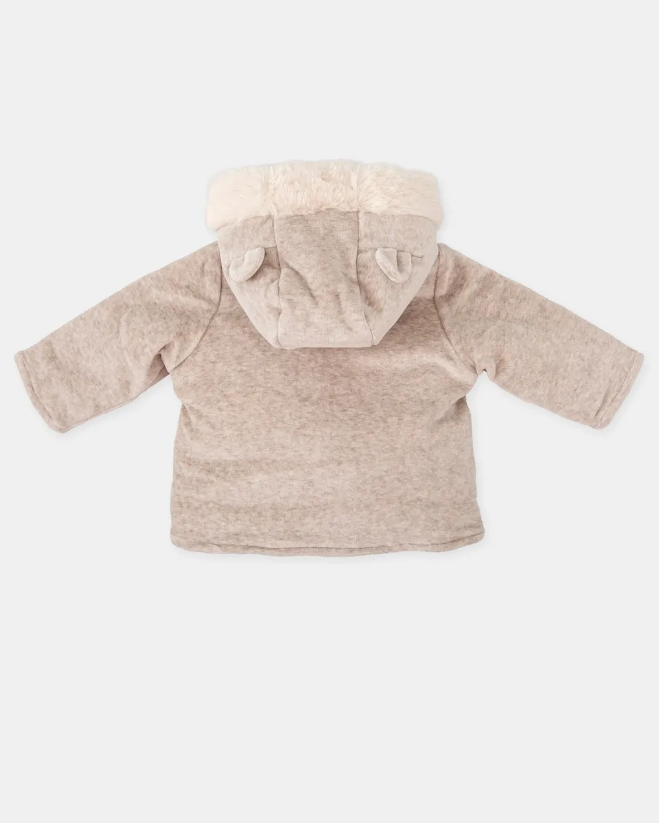 Пальто-трансформер серого цвета с мягкой подкладкой из натурального меха. Капюшон с ушками. Вышитый логотип. Передняя застежка на пуговицы.