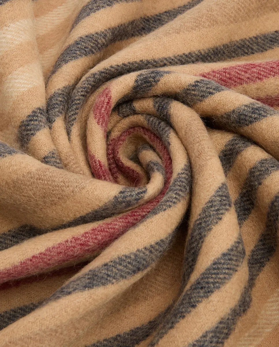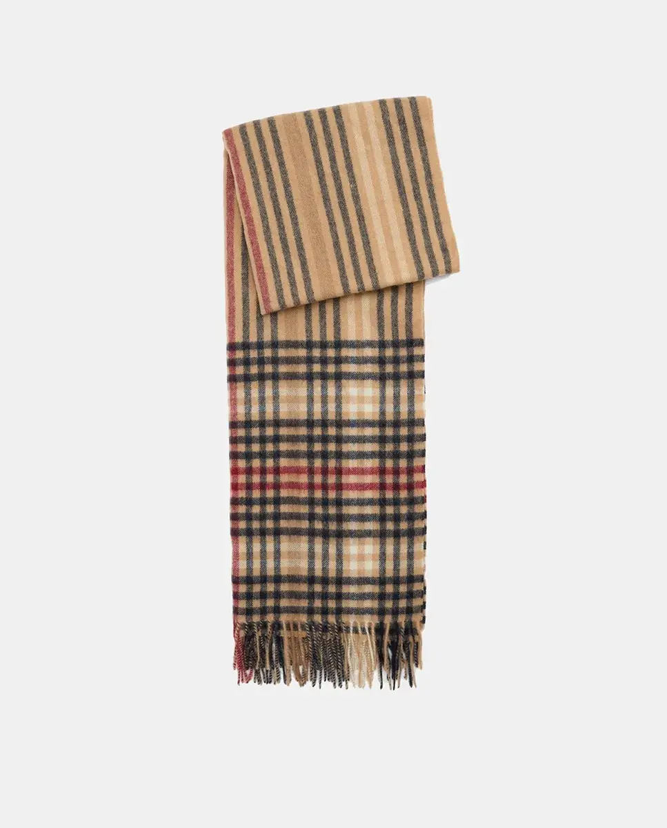 Шерстяной шарф из 100% овечьей шерсти с клетчатой каймой и полосатым узором. Подол с кисточками.