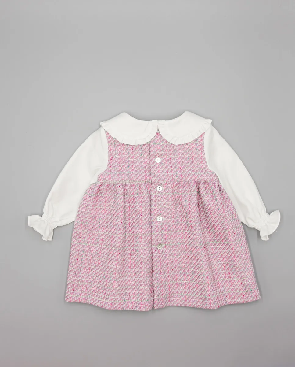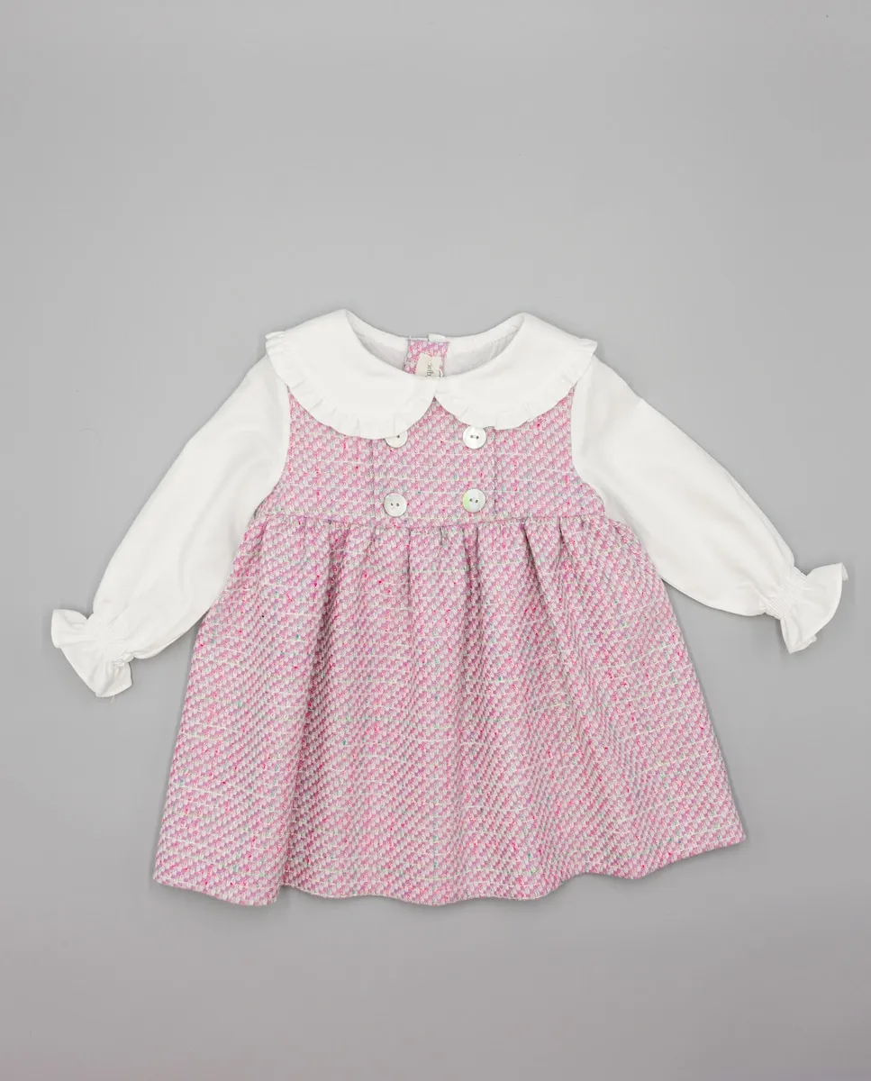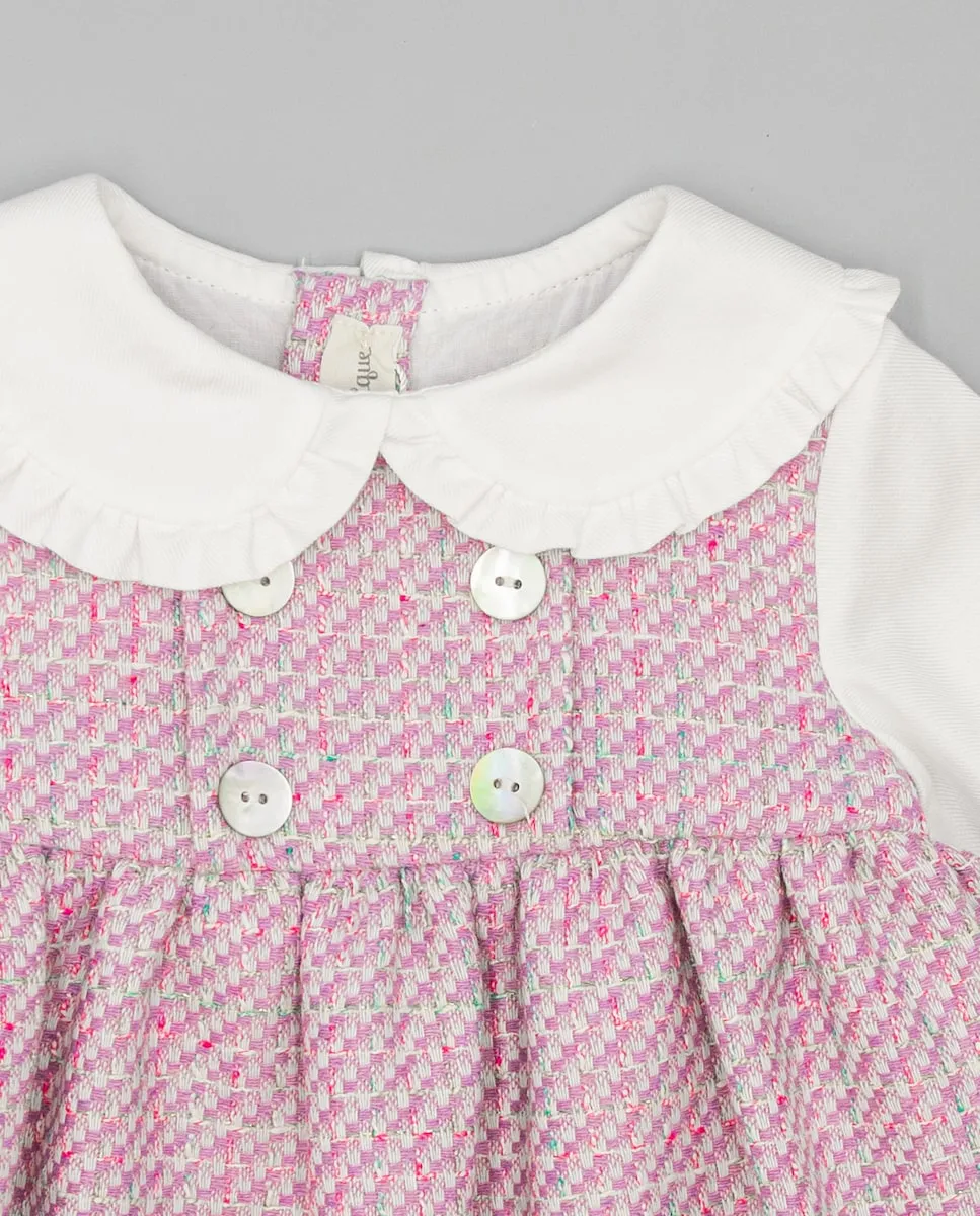 Сарафан-платье из структурированной ткани лилового цвета с воротником и длинными рукавами из белого вуаля. Воротник украшен маленькой оборкой. Пояс на талии, юбка присборена. Манжеты с резинкой для лучшей посадки. Застежка сзади на пуговицы, декоративные перламутровые пуговицы на сборках спереди. Полностью подкладка из 100% хлопка. Доступно в размерах от 3 месяцев до 6 лет.