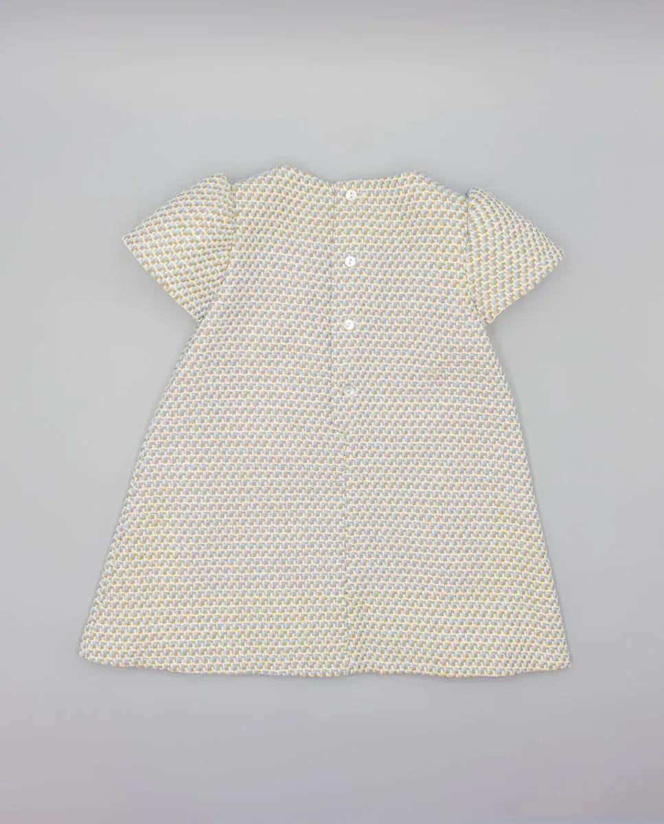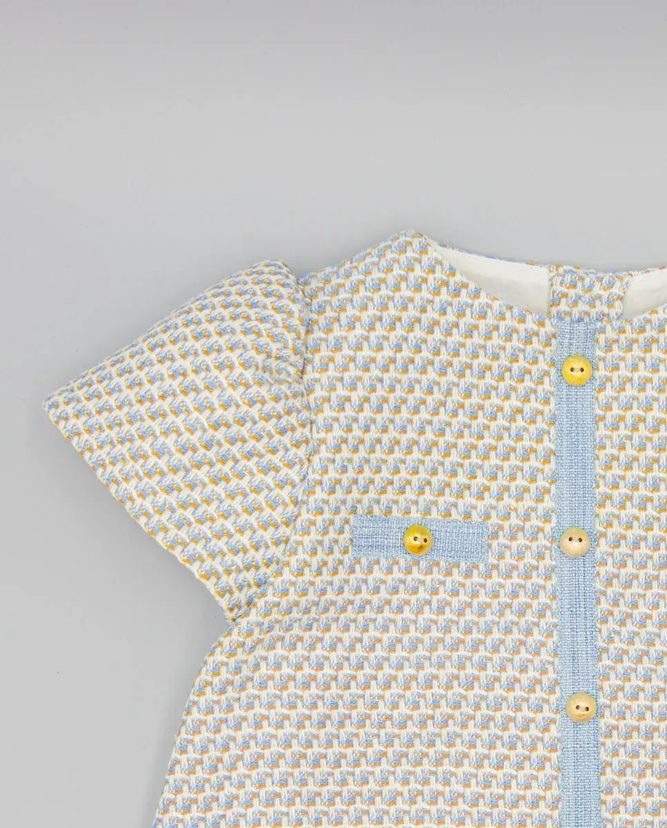 Синее платье из структурированной ткани с золотыми металлическими пуговицами. Клешеный крой, короткие рукава и круглый вырез. Стропа из гросгрейна спереди с четырьмя декоративными кармашками, на которых расположены золотые пуговицы. Доступно в размерах от 2 до 16 лет. Подкладка из 100% хлопка.