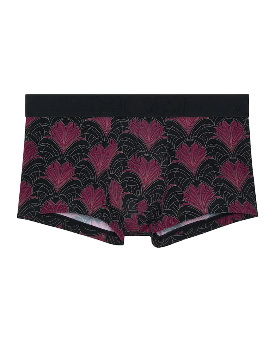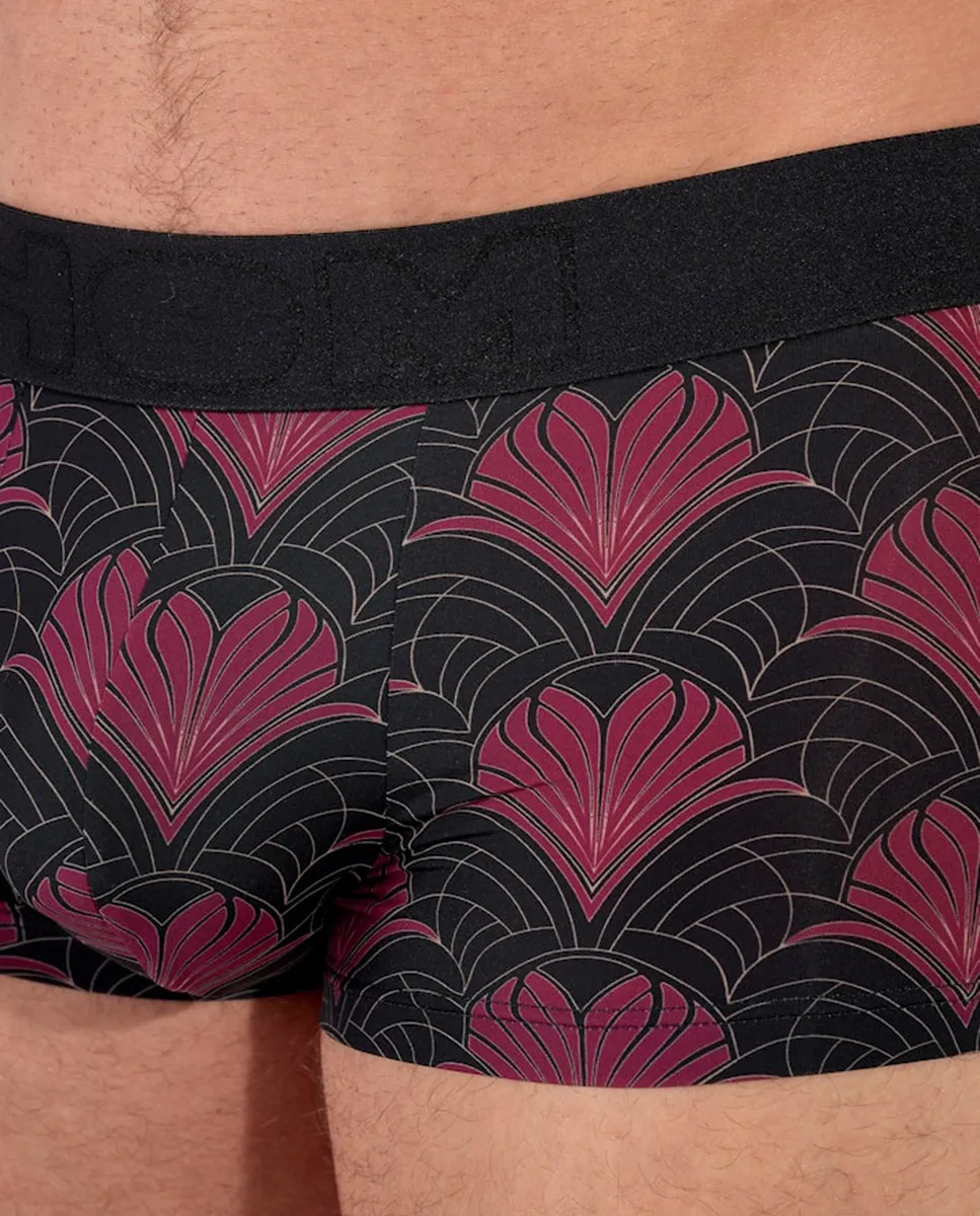 Боксерские трусы из мягкой полиамида с плотной вязкой. Принт с цветочными мотивами красного и золотого цвета на черном геометрическом фоне, в стиле Арт Деко. Снабжены черным эластичным поясом. Ложатся на тело как вторая кожа.