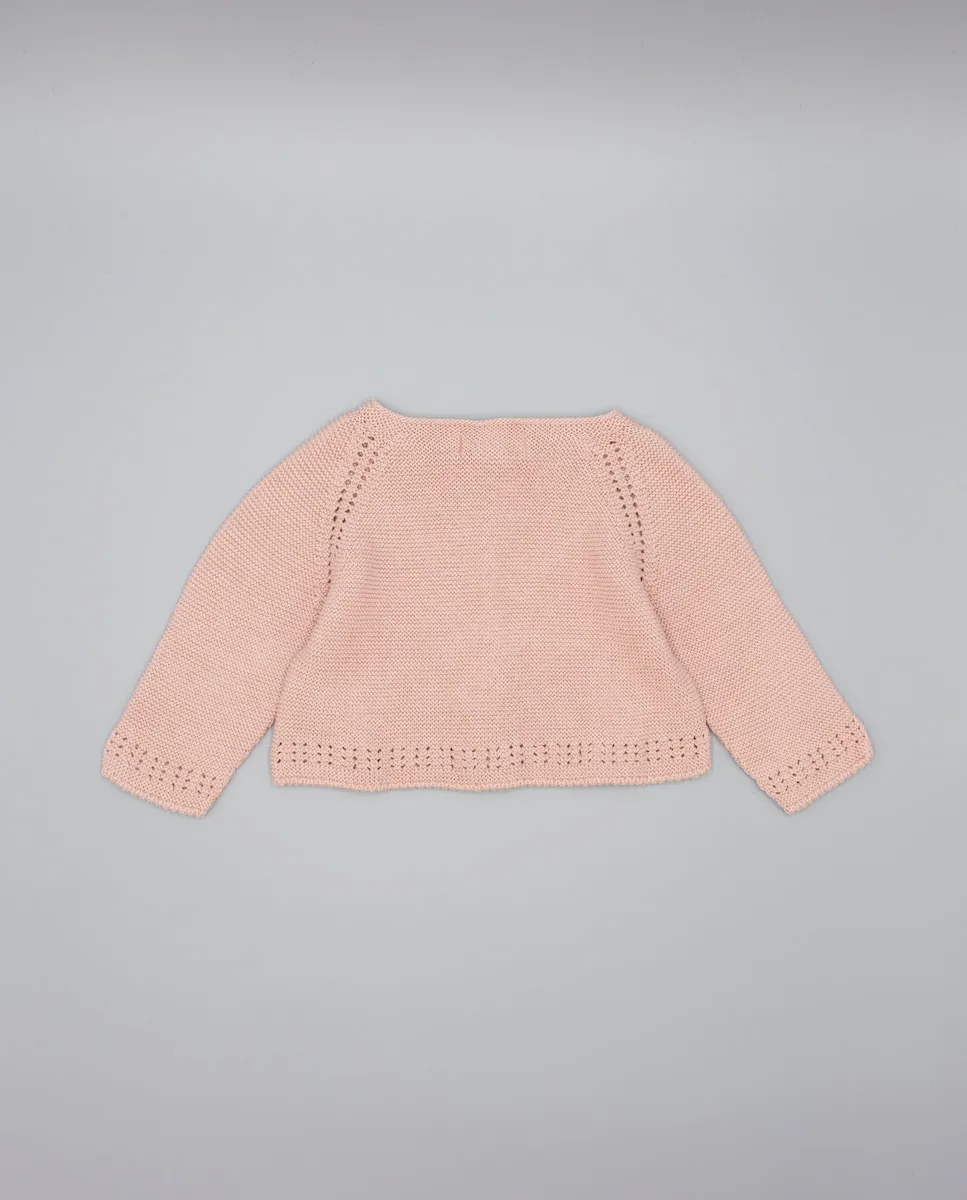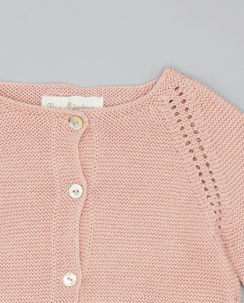 Розовая трикотажная куртка для девочки, выполненная без швов для максимального комфорта и мягкости. Классический дизайн с застежкой на пуговицы и воротником стойкой. Доступна в размерах от 3 месяцев до 14 лет. Идеально подходит, чтобы девочка оставалась в тепле с комфортом и стилем.