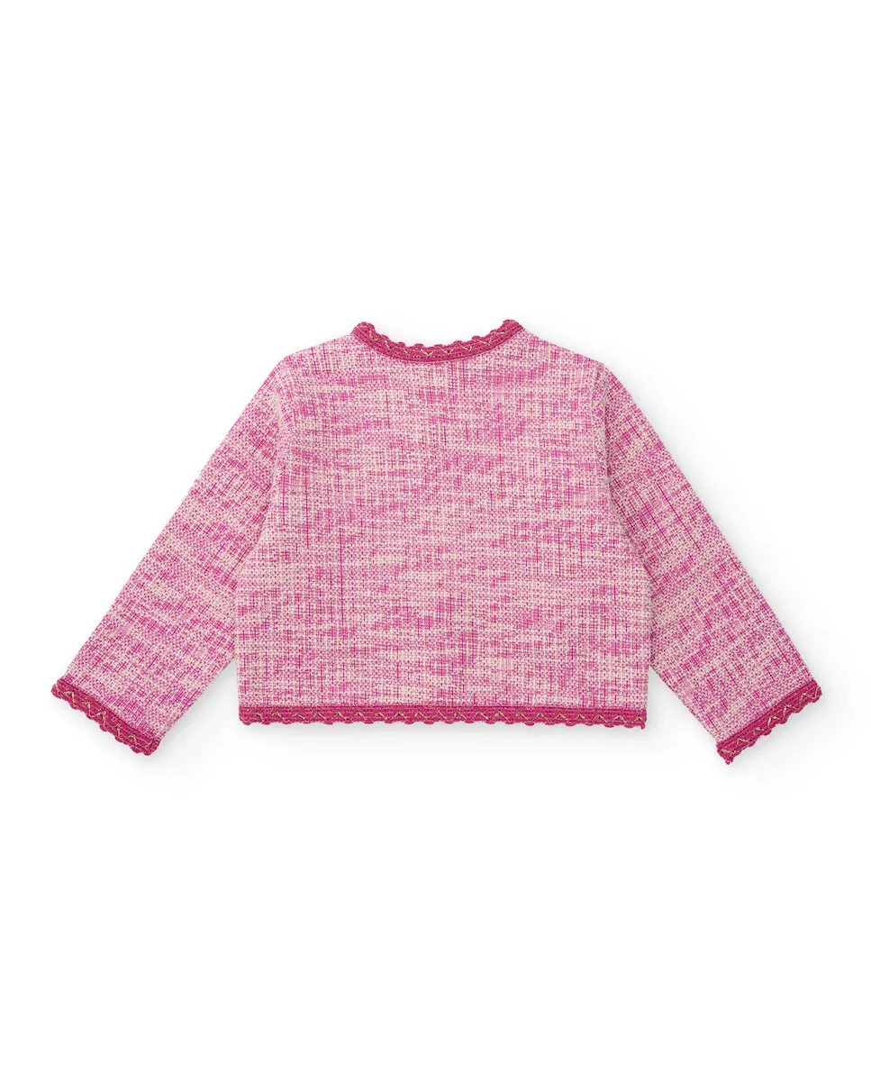 Куртка для девочки розового цвета с мраморной текстурой и деталями цвета фуксии. Имеет золотые пуговицы спереди и декоративные карманы. Дизайн включает кружевные края, которые подчеркивают ее элегантный и современный стиль. Идеально подходит, чтобы придать любому наряду изысканный вид.