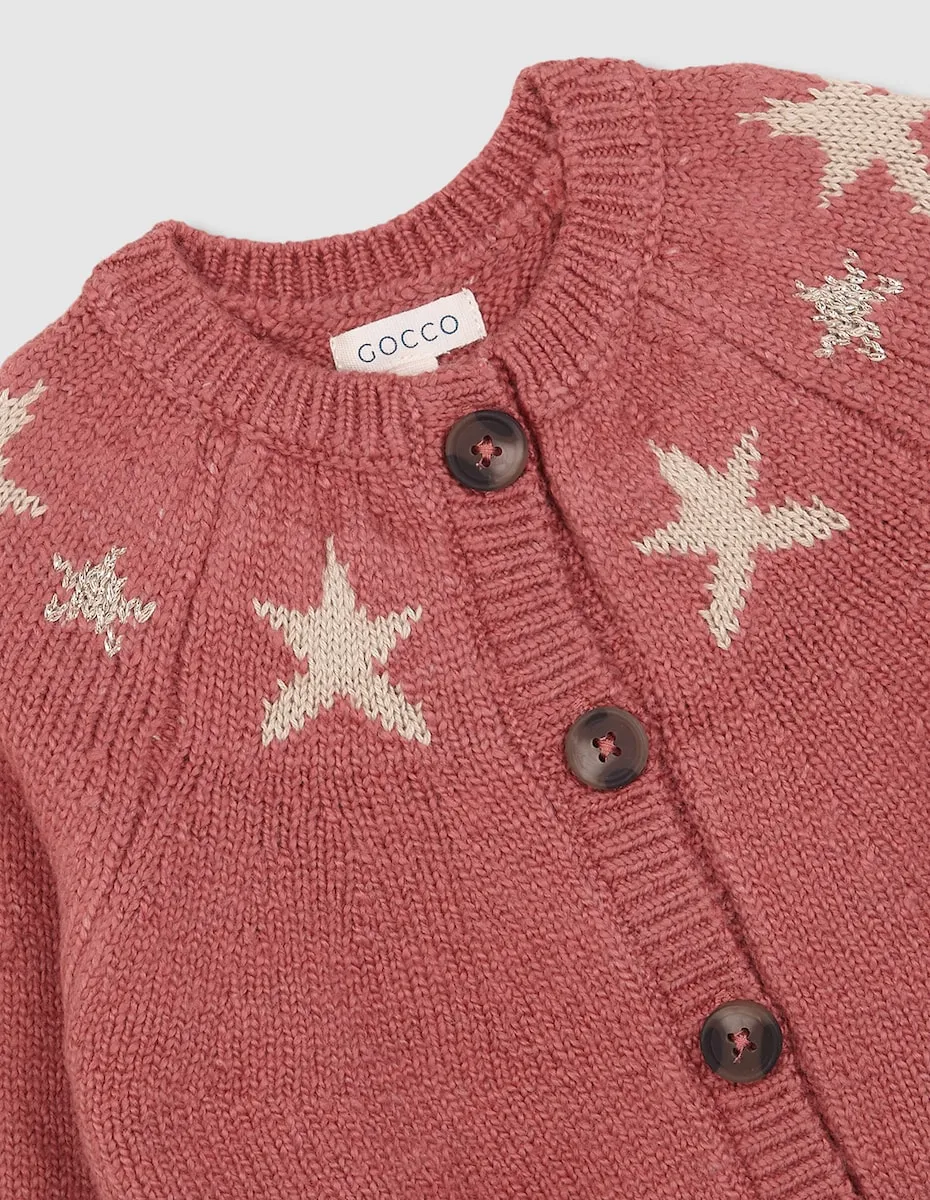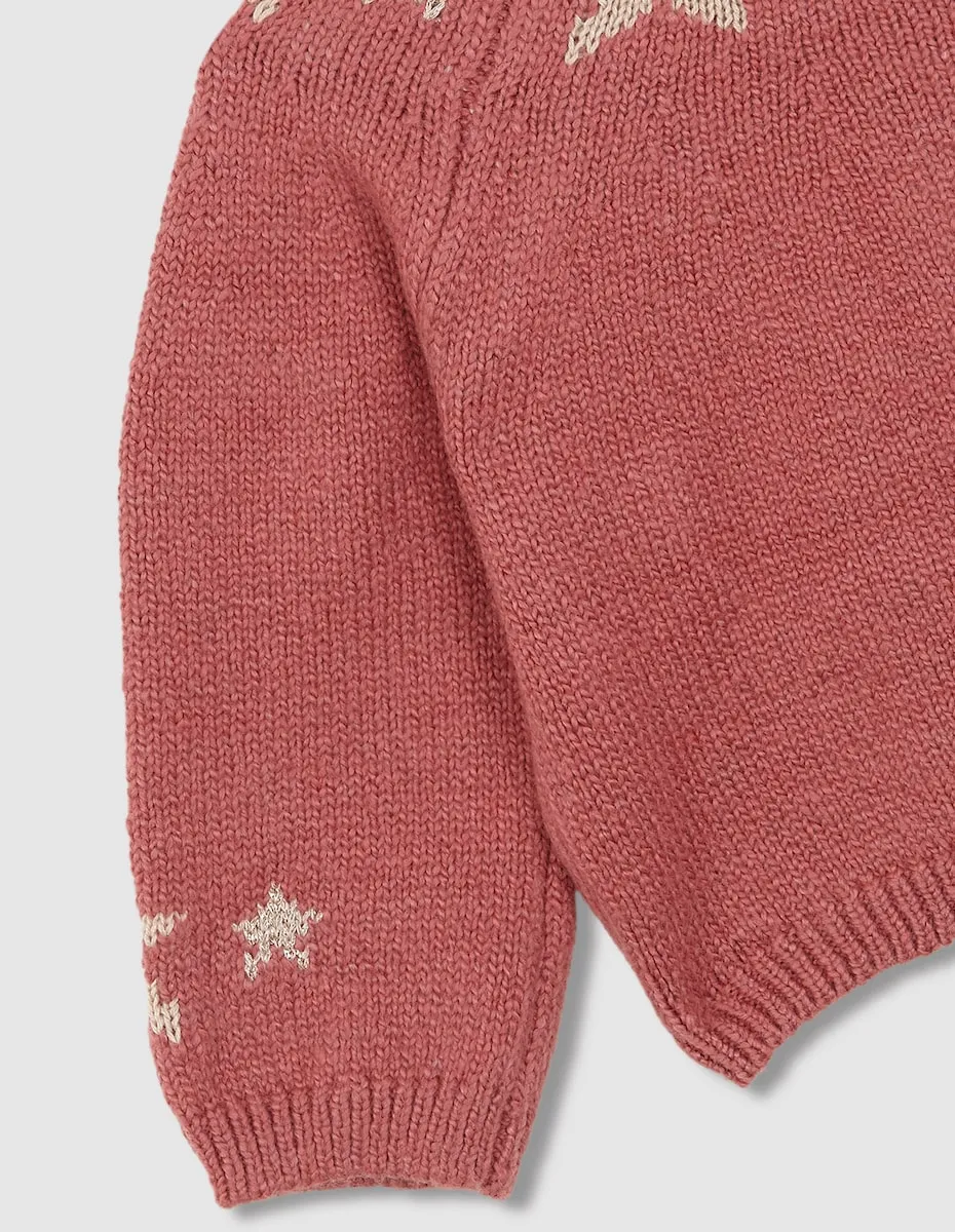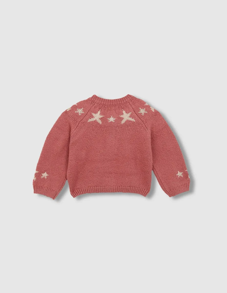 Куртка с интарсией звезд, падающими плечами, круглый вырез и резинка на низу и манжетах.