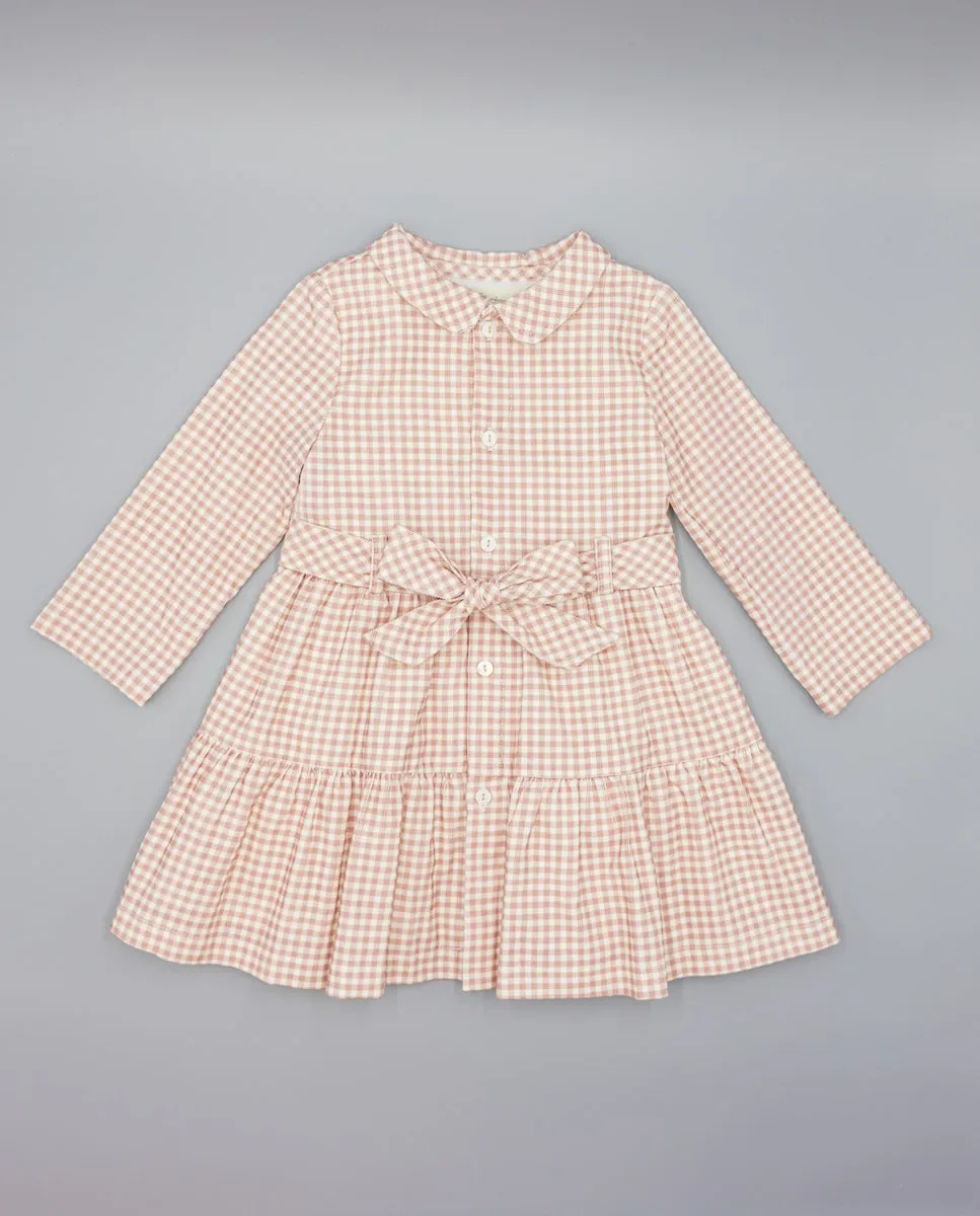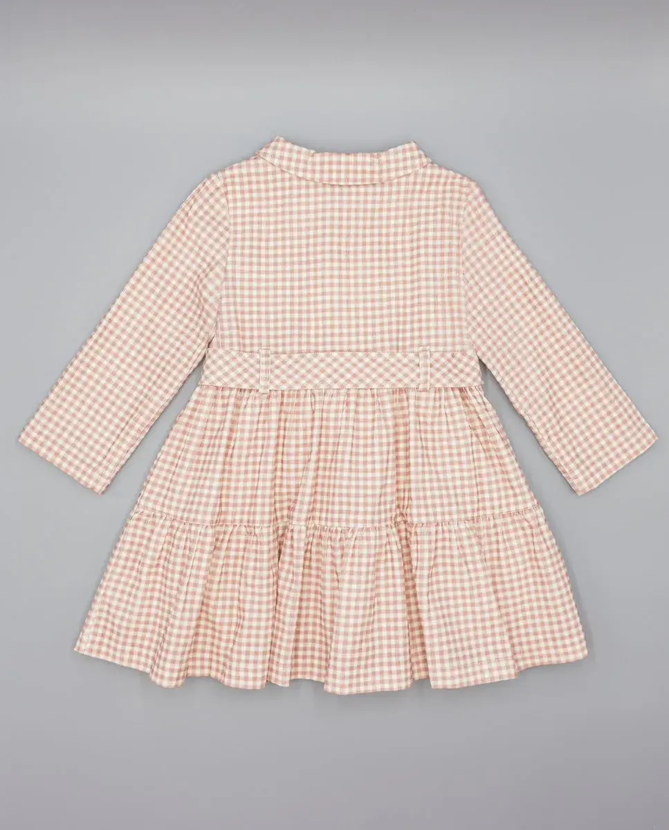 Розовое вельветовое платье в клетку для девочки, ткань 100% хлопок, подкладка также 100% хлопок. Рубашечный покрой, приталенное на талии с поясом из той же ткани, образующим бант. Юбка с двумя оборками и покроем по бедрам. Доступно в размерах от 2 до 16 лет.