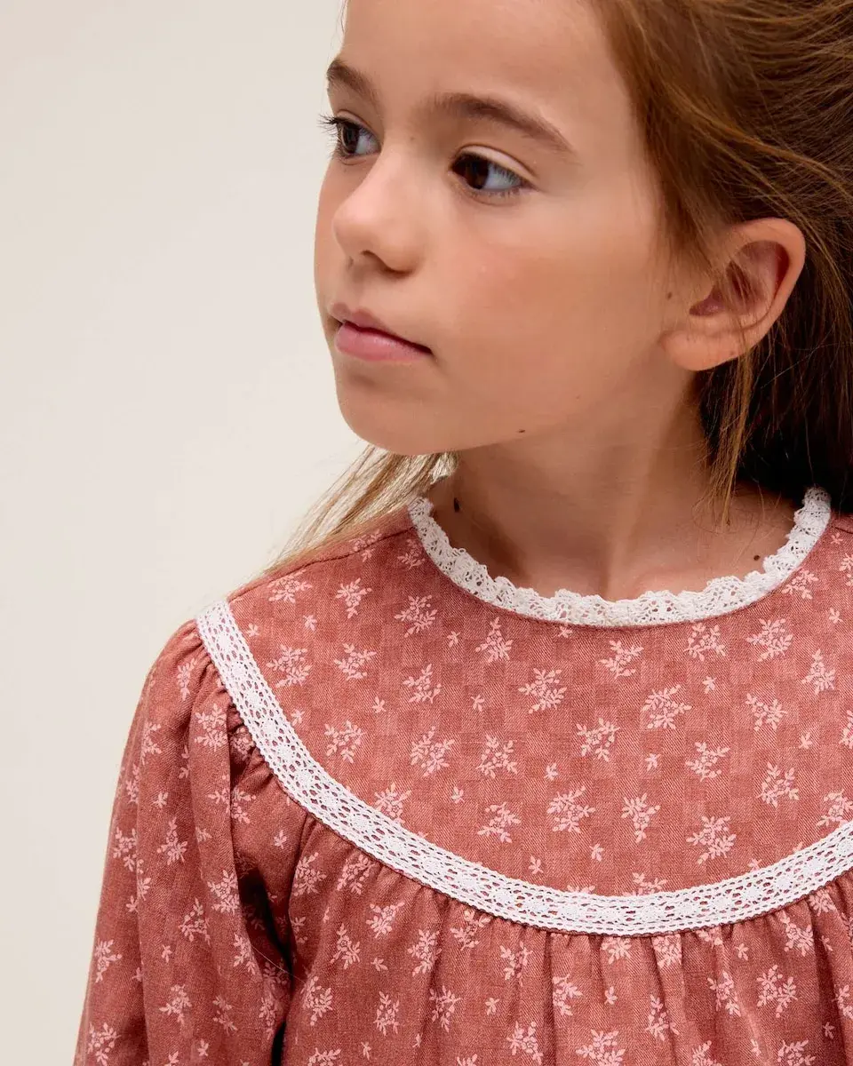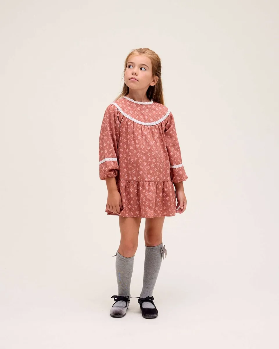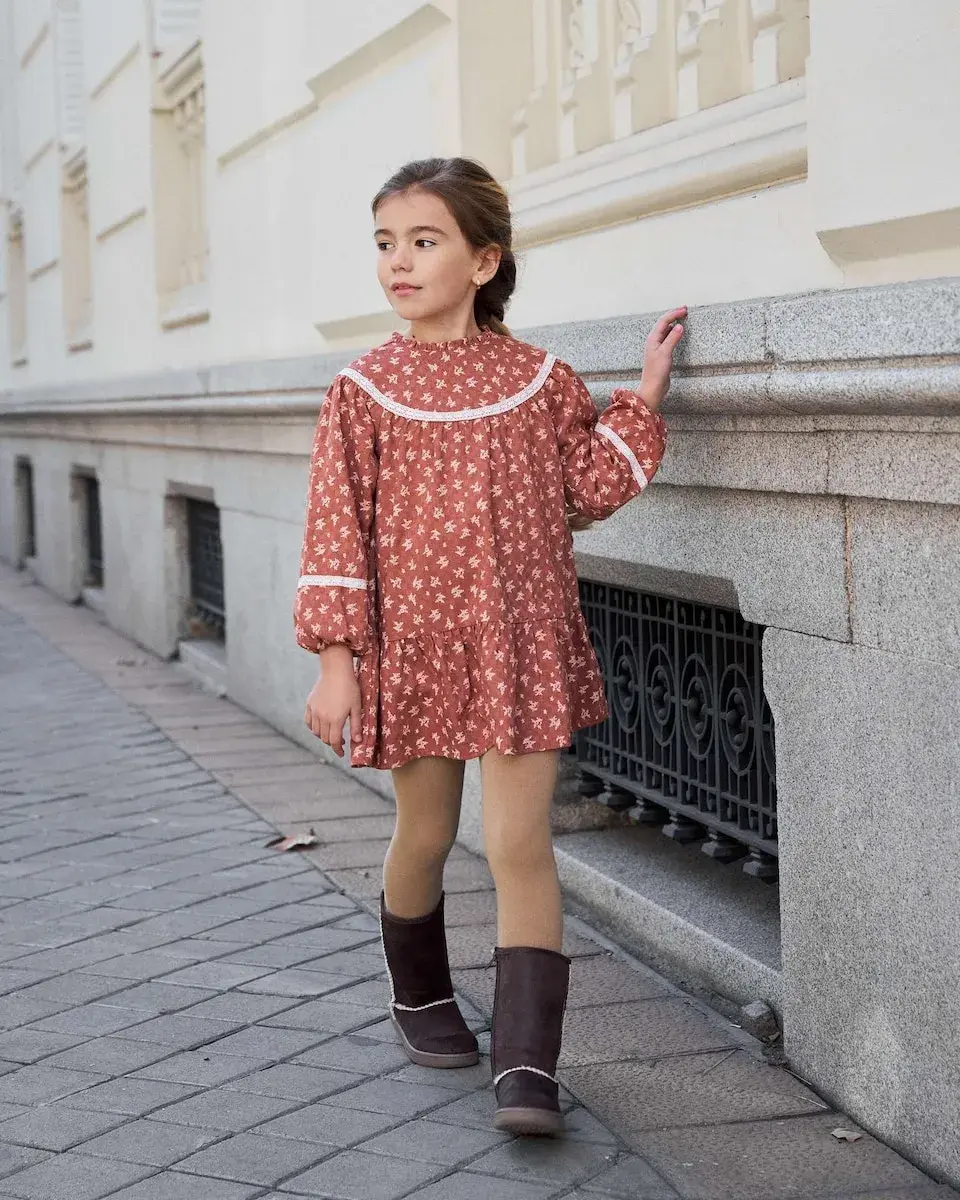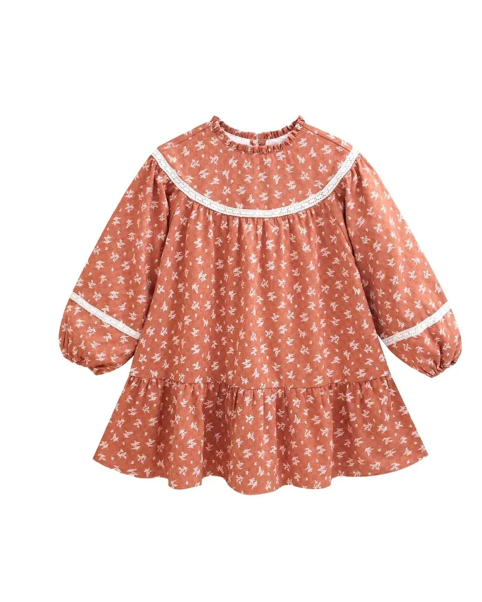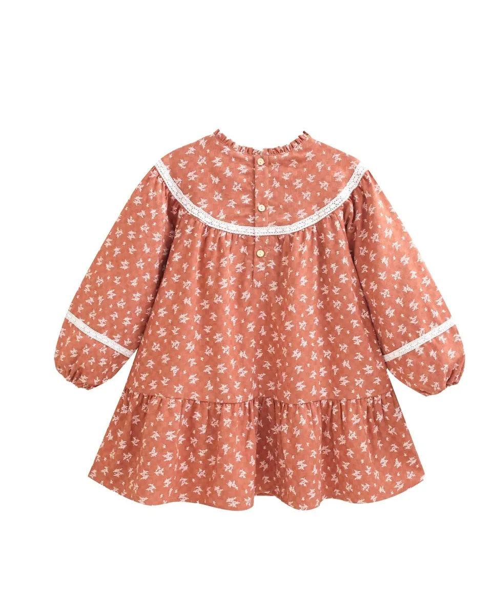 Девочковое платье кроя «трапеция» с принтом в виде листьев и отделкой спереди, с присборенным воротником и длинными рукавами.