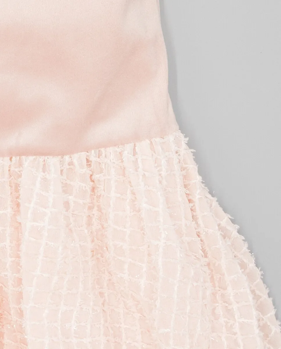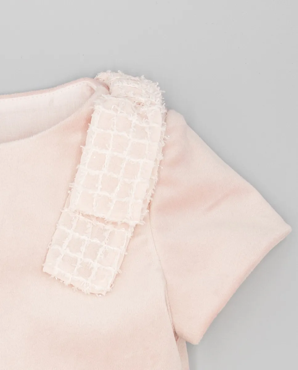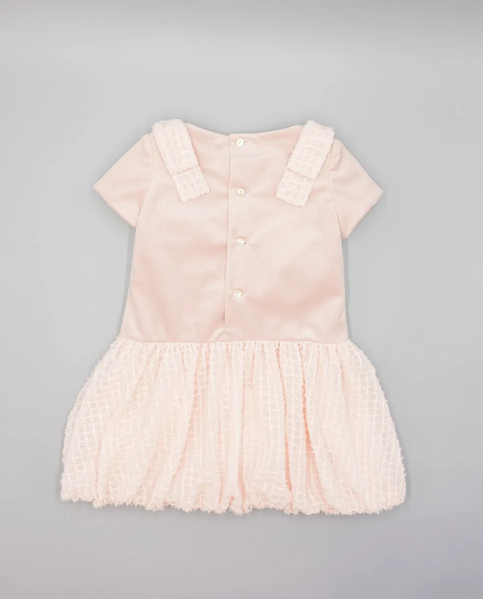 Детское платье с верхом из розового бархата и юбкой из структурированной ткани. Срез на бедрах, с присборенной юбкой, придающей движение. Прямой короткий рукав и воротник-стойка, слегка открытый. Украшено бантами на плечах, выполненными из той же структурированной ткани, что и юбка. Подкладка из 100% хлопка. Доступно в размерах от 2 до 16 лет.