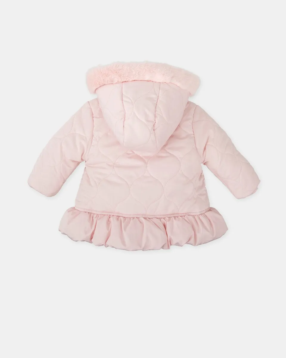 Парка с капюшоном из розового стеганого микрофибрового материала с подкладкой из микрополара того же цвета. Детали: меховая вставка на капюшоне и оборка по низу. Передняя застежка на молнию.