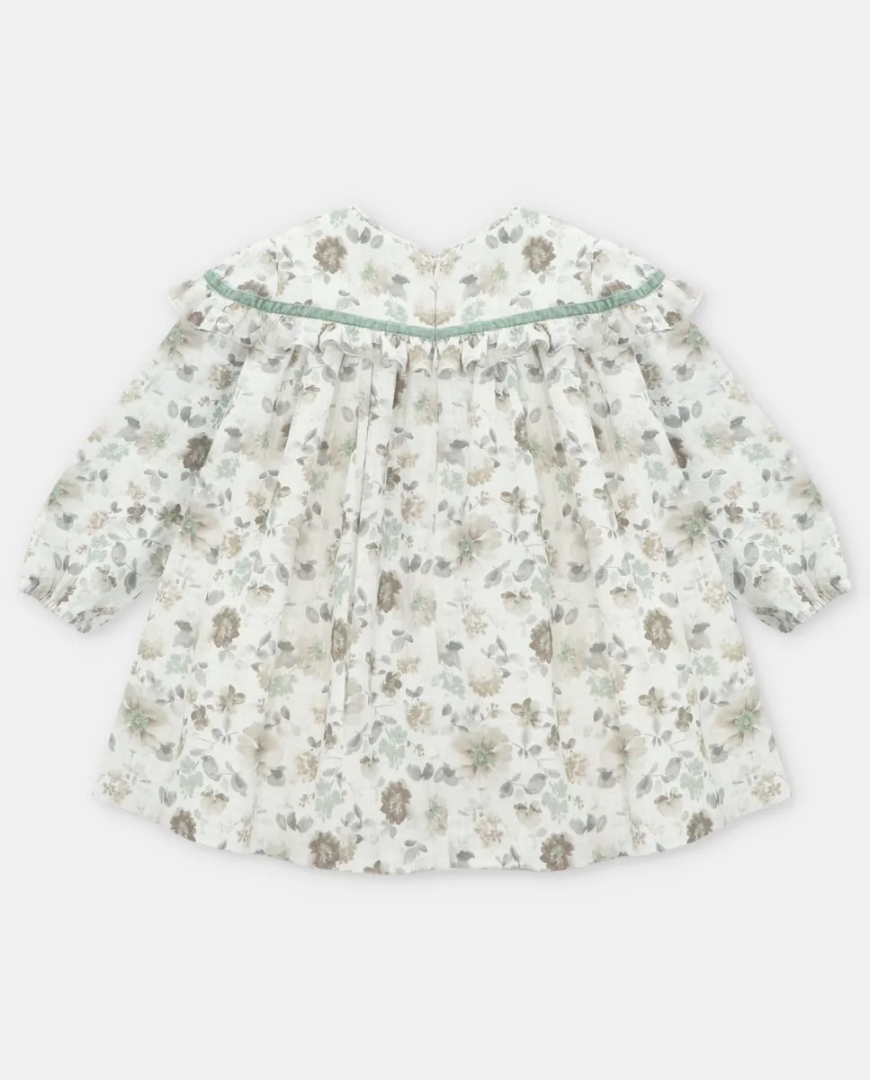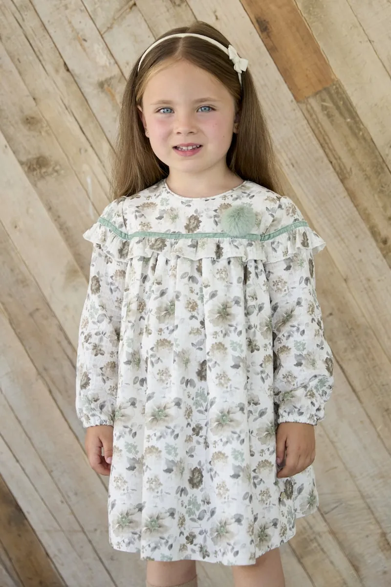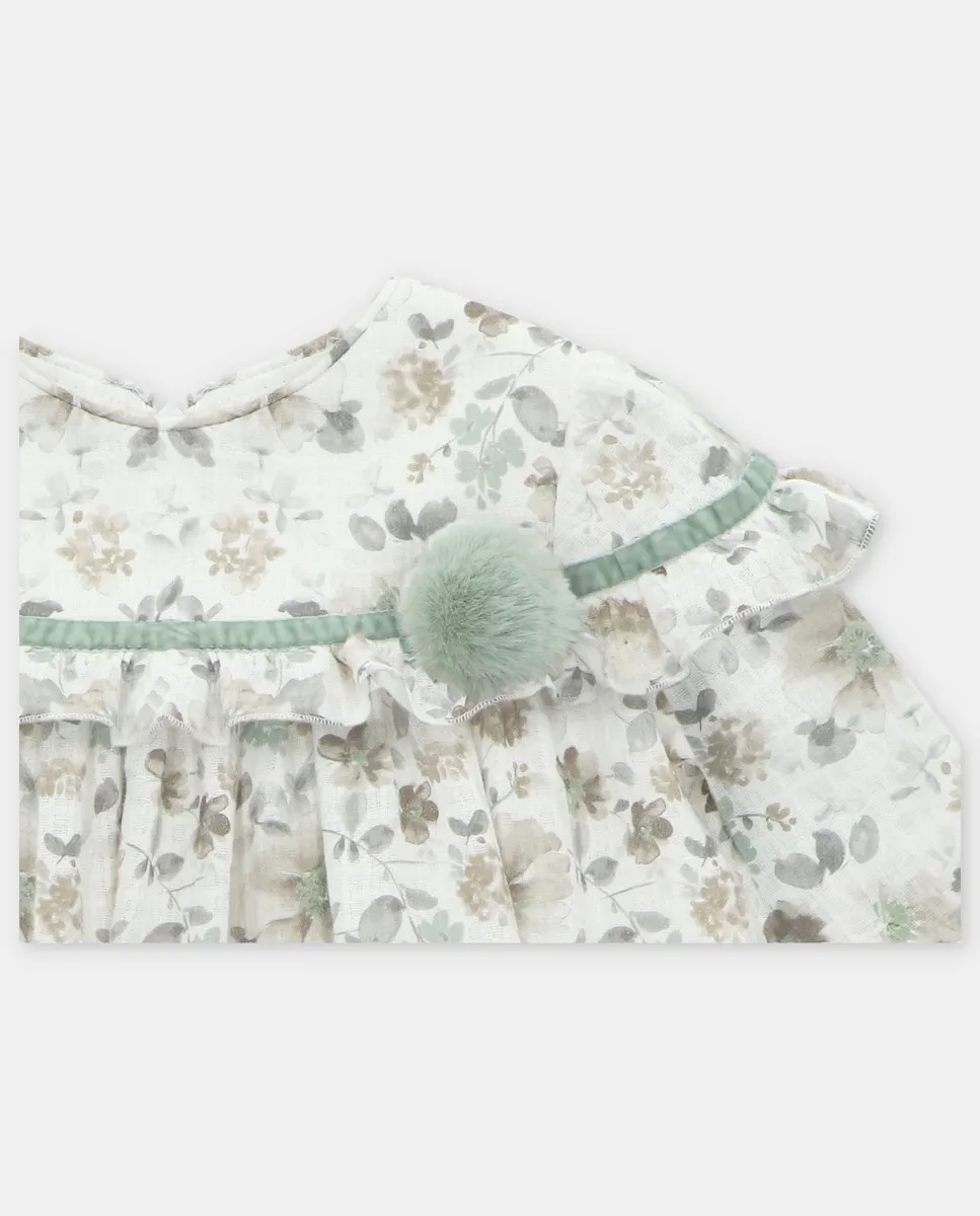 Детское платье из ткани с цветочным узором, украшенное бархатной лентой и помпоном на кокетке, с воланом и овальной пластинкой, зеленого цвета. Изготовлено из 100% хлопка. Сделано в Испании.