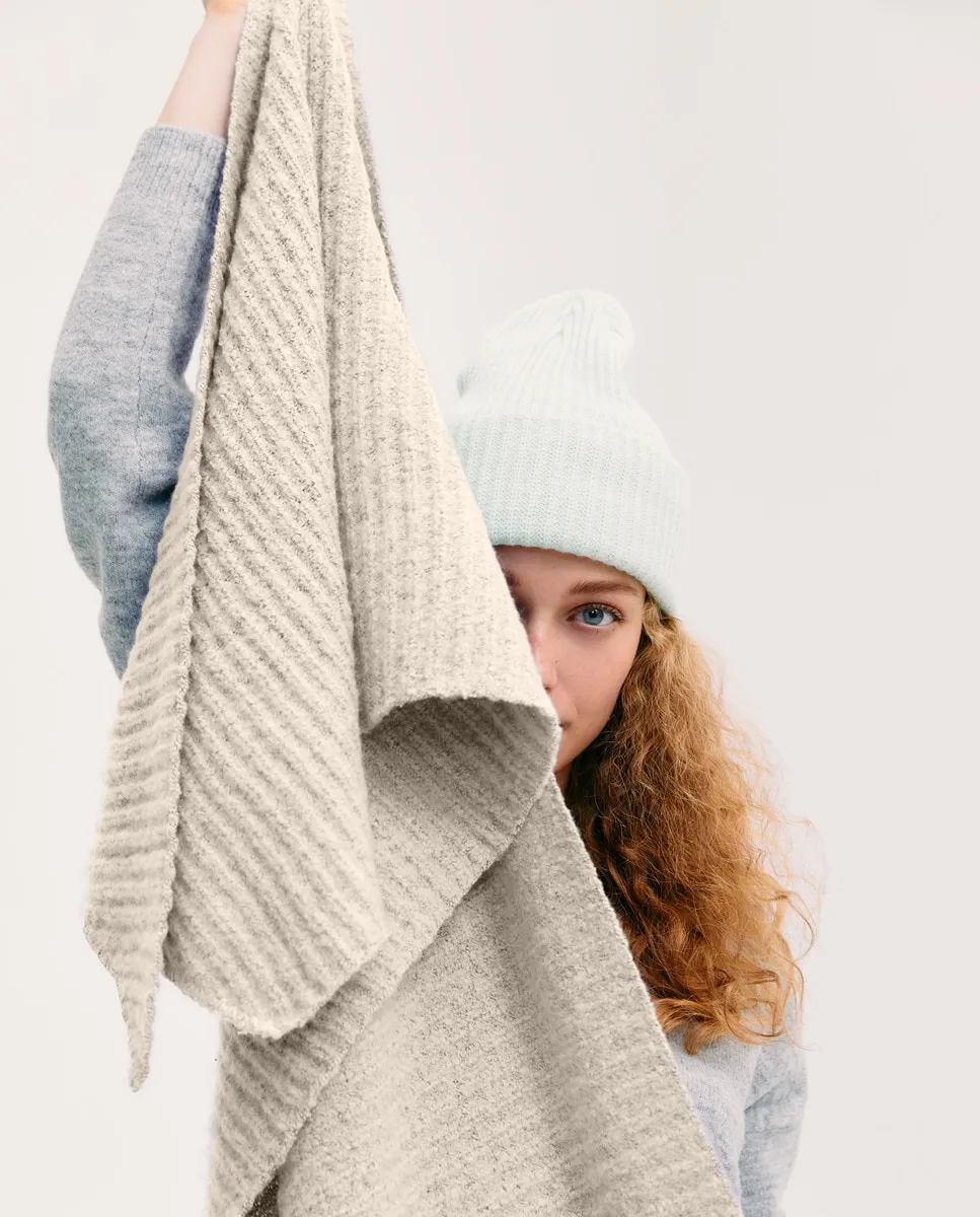 Однотонный светло-серый шарф с рельефной структурной вязкой.