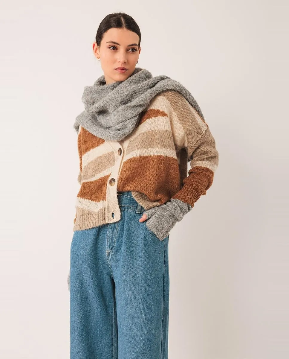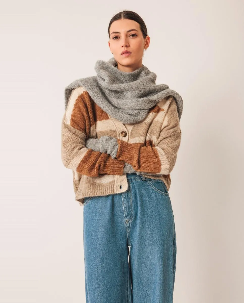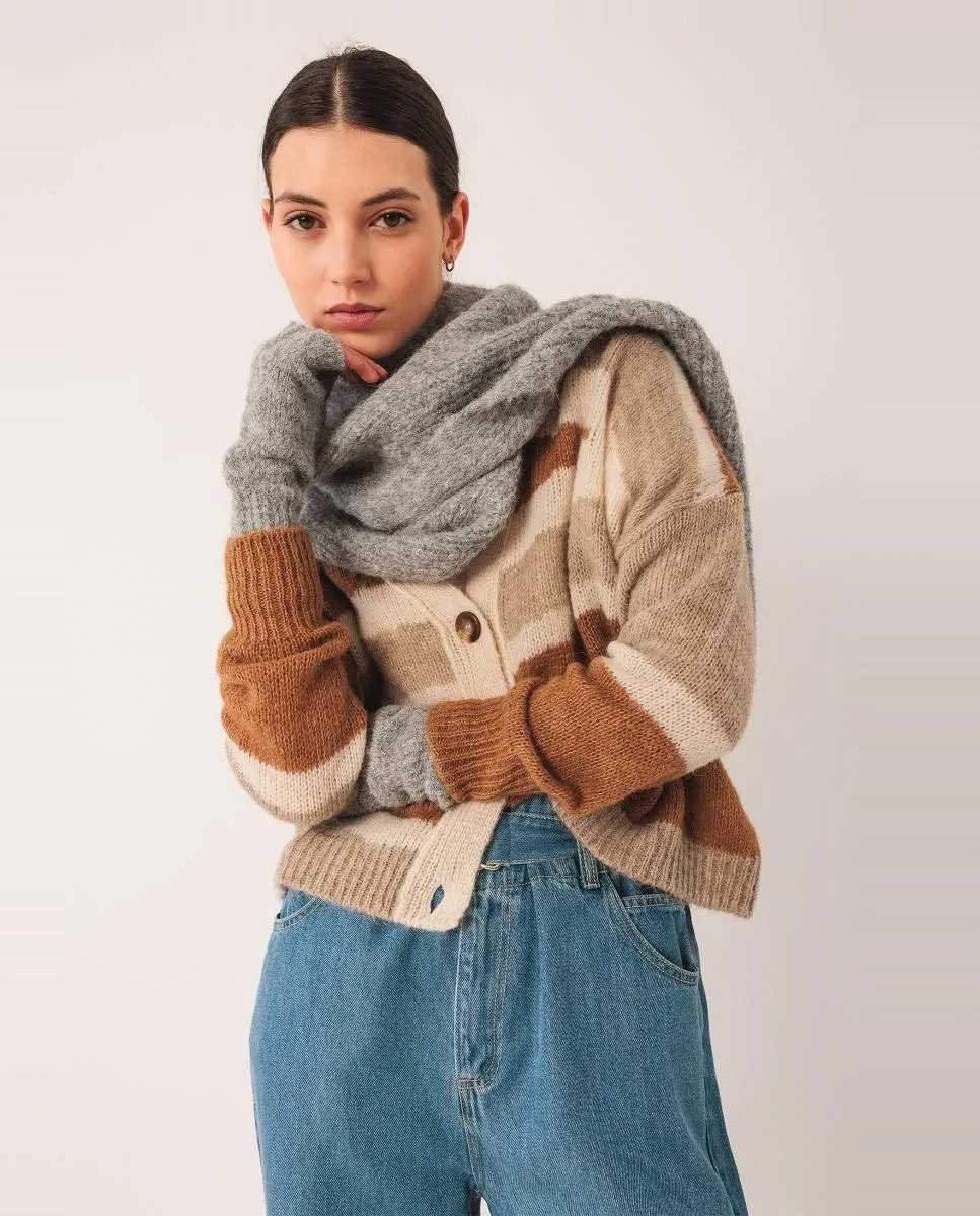 Длинный вязаный шарф из пряжи с переработанными волокнами.