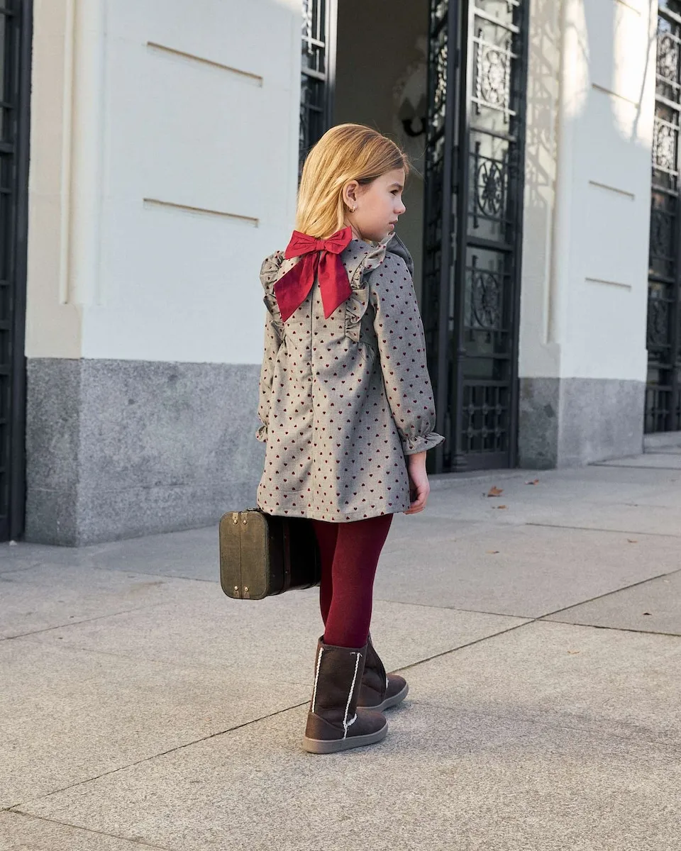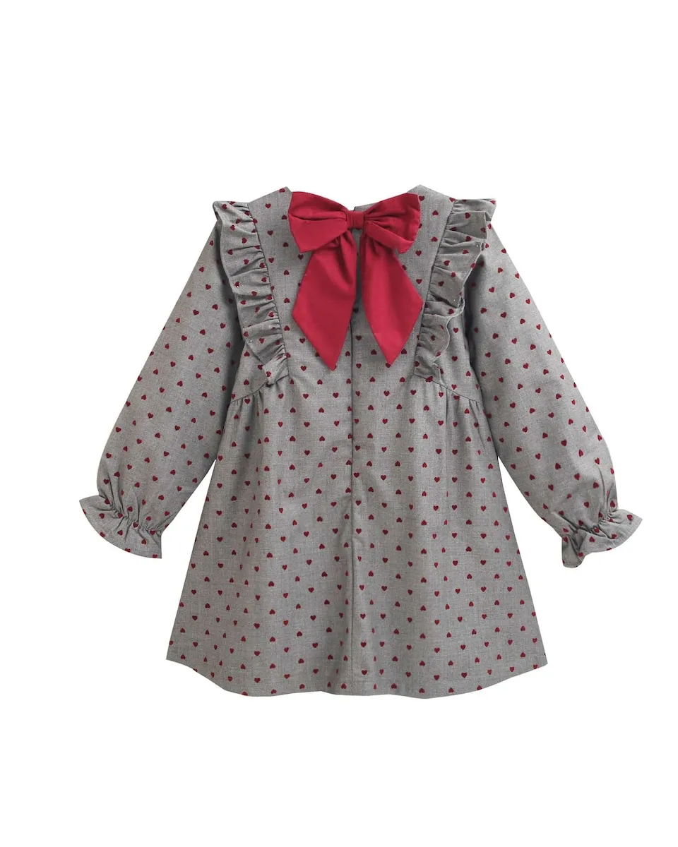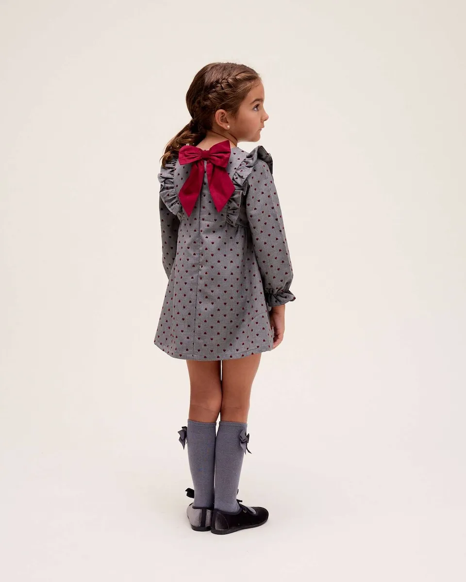 Платье для девочки расклешенное с бархатными сердечками, длинный рукав, эластичный манжет, боковые оборки спереди и бордовый бант на спине с застежкой сзади.