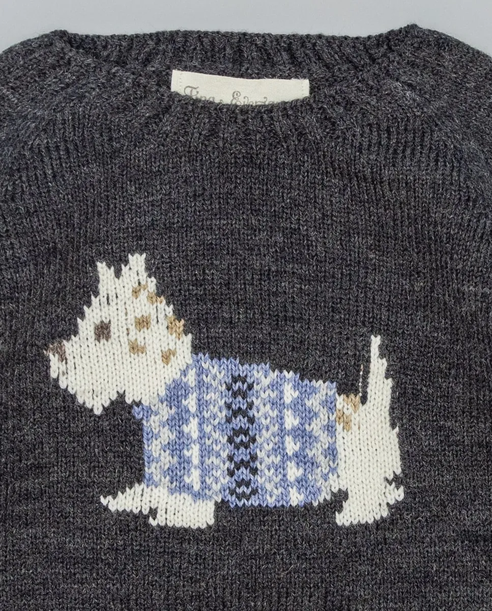 Вязаный серый джемпер с собакой в технике интарсия на передней части. Собака в свитере бежевых, верблюжьих, светло-серых и синих оттенков. Бесшовный дизайн для большего комфорта. Мягкая и теплая ткань. Доступен в размерах от 3 месяцев до 12 лет.