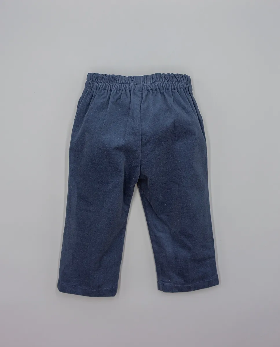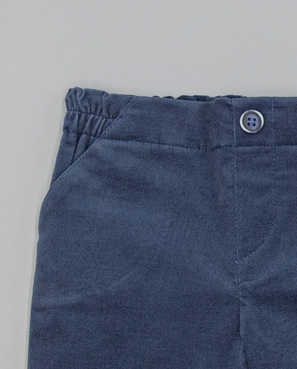 Синие бархатные брюки. Состав: 97% хлопок и 3% эластан. Резинка на талии с уретановой пуговицей. Доступны размеры от 3 месяцев до 6 лет.