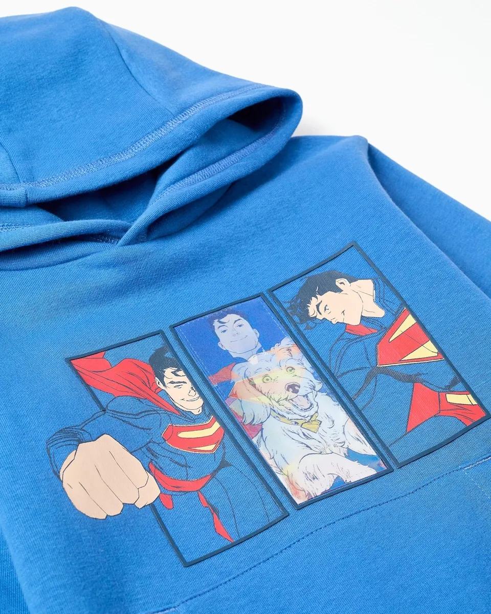 Синяя толстовка Warner Bros для мальчика с мягкой внутренней поверхностью для лучшего термального комфорта. 100% хлопок. С капюшоном. Принт с Суперменом на передней части и на правом рукаве. Ребристые края для идеальной посадки. Карман-кенгуру. Отлично подходит для фанатов Супермена!
