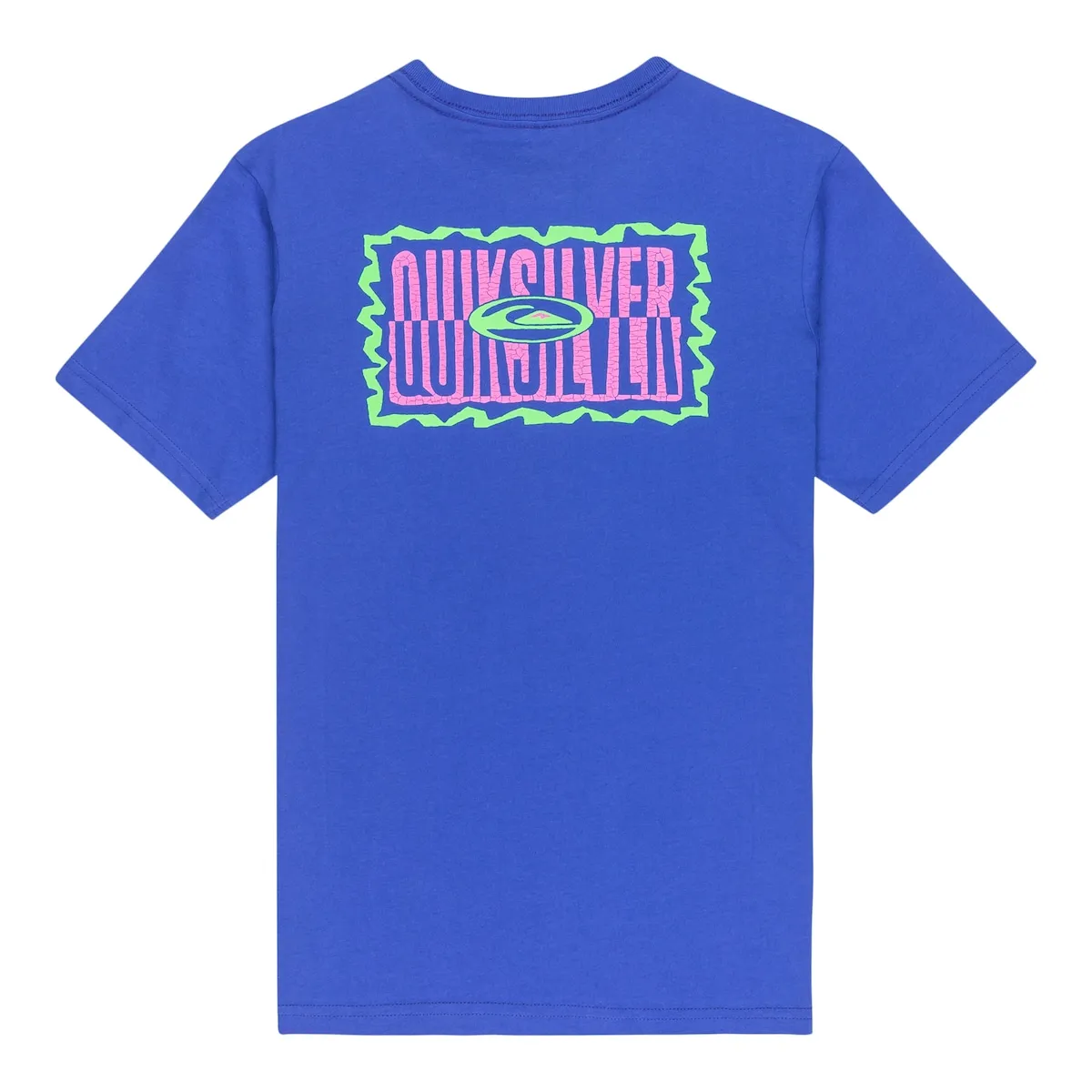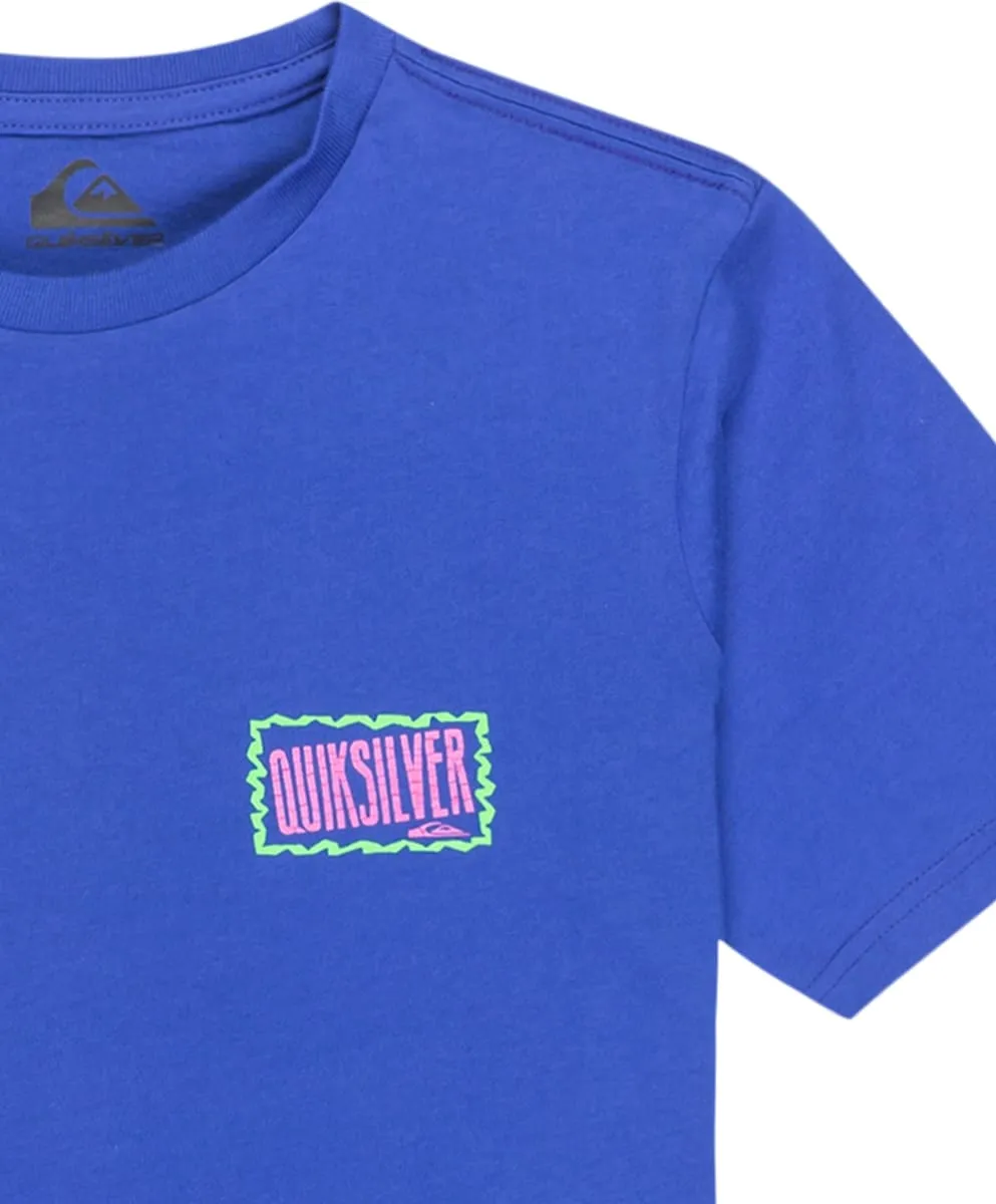 Футболка с короткими рукавами для детей 8-16 лет. Характеристики включают: Материал: хлопковый трикотаж [160 г/м²], Крой: обычный, Воротник: круглый, Принт на груди и спине, Бирка Quiksilver на подоле рукава.