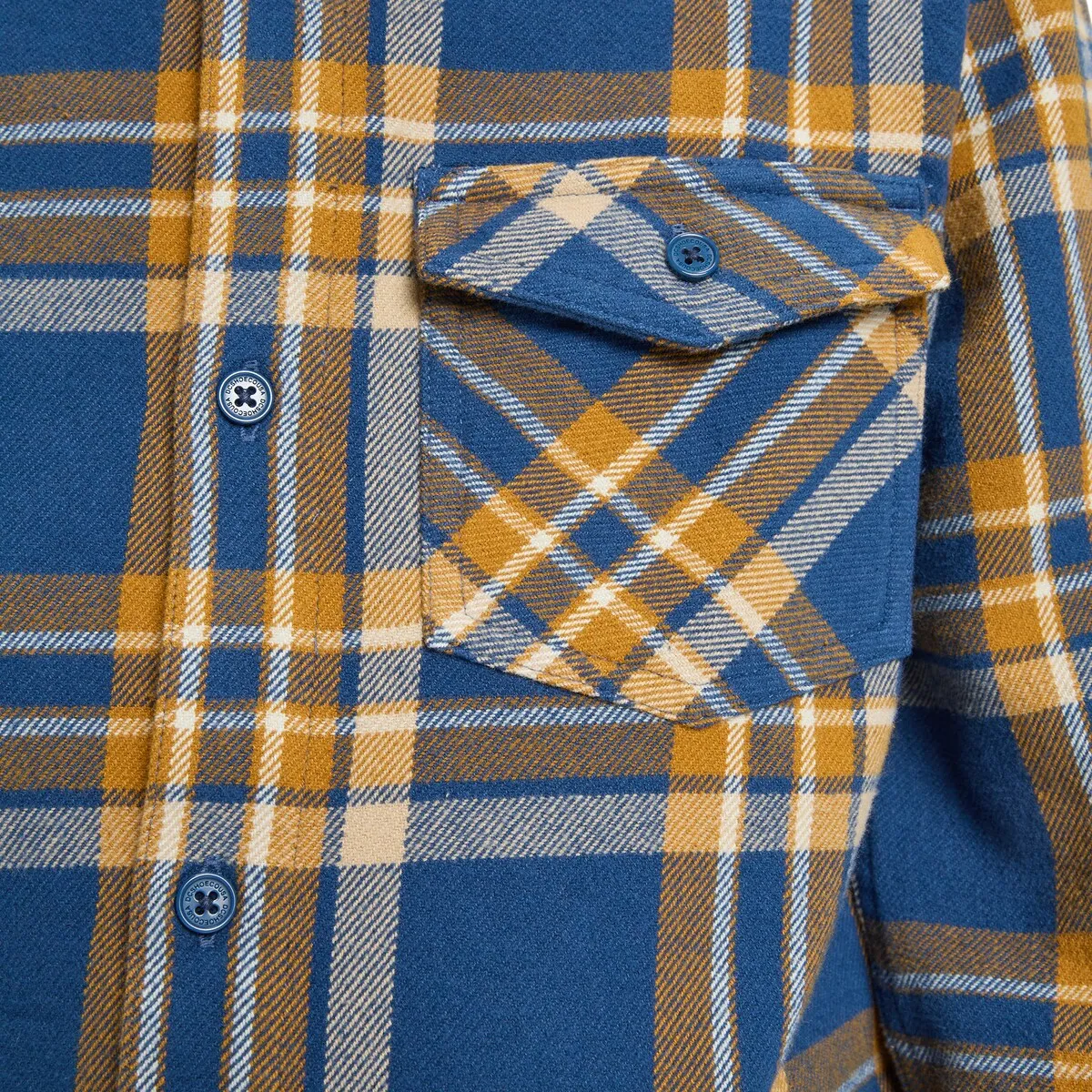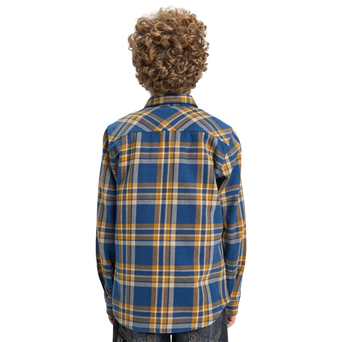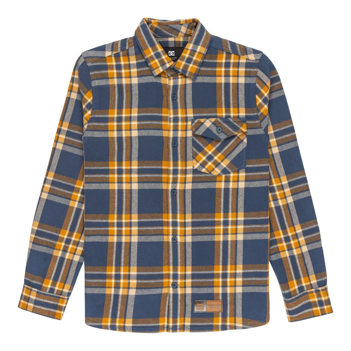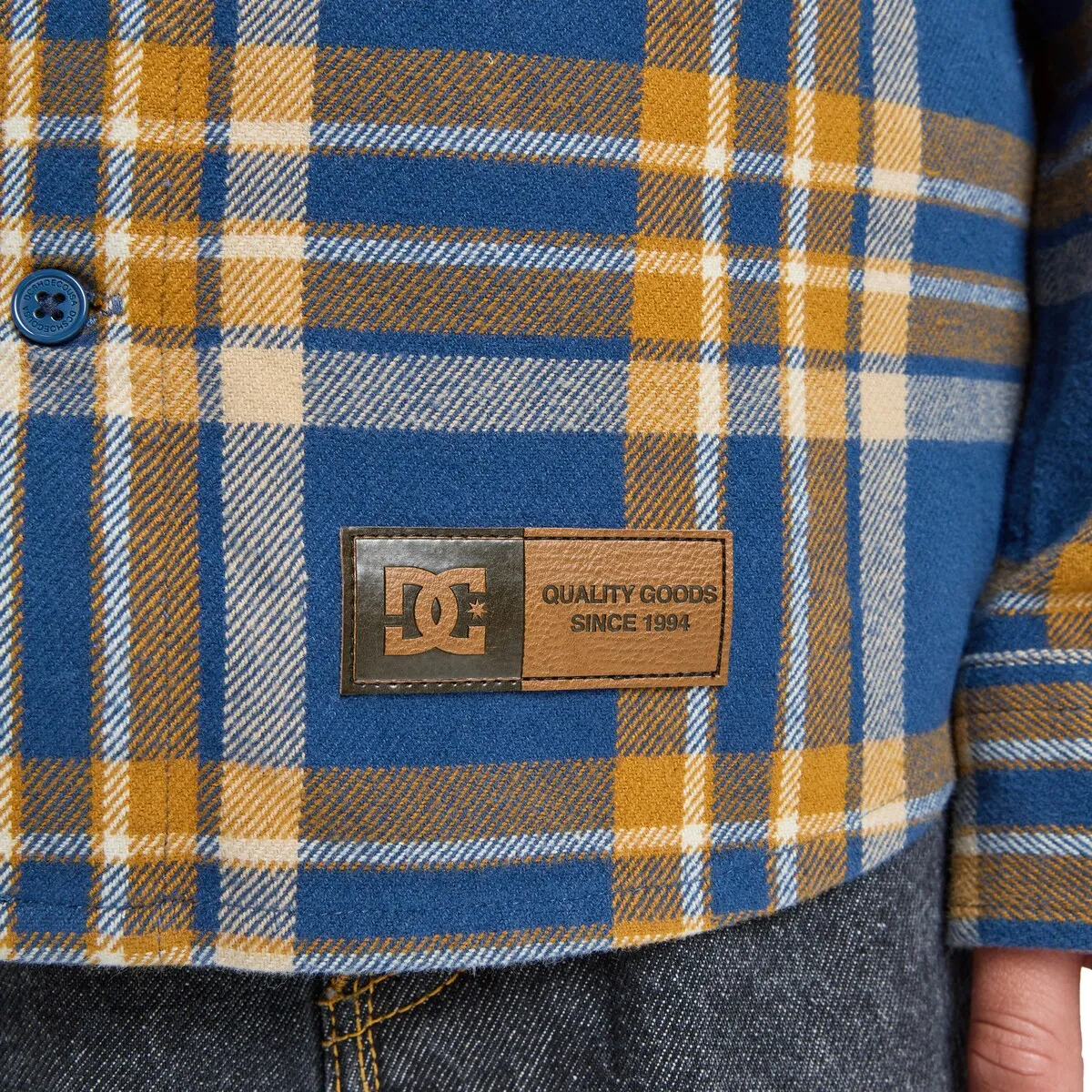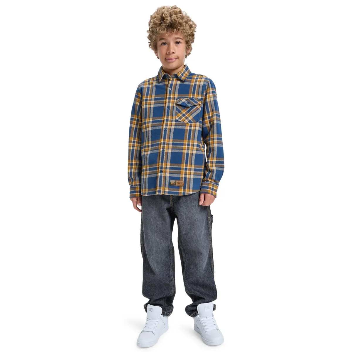 Фланелевая футболка для детей 8-16 лет. Характеристики включают: Ткань: хлопковая фланель [215 г/м²], стандартный крой, воротник с пуговицами, нагрудный карман на пуговице, слегка начесанная, рукав с круглым PU-нашивкой и детали DC.