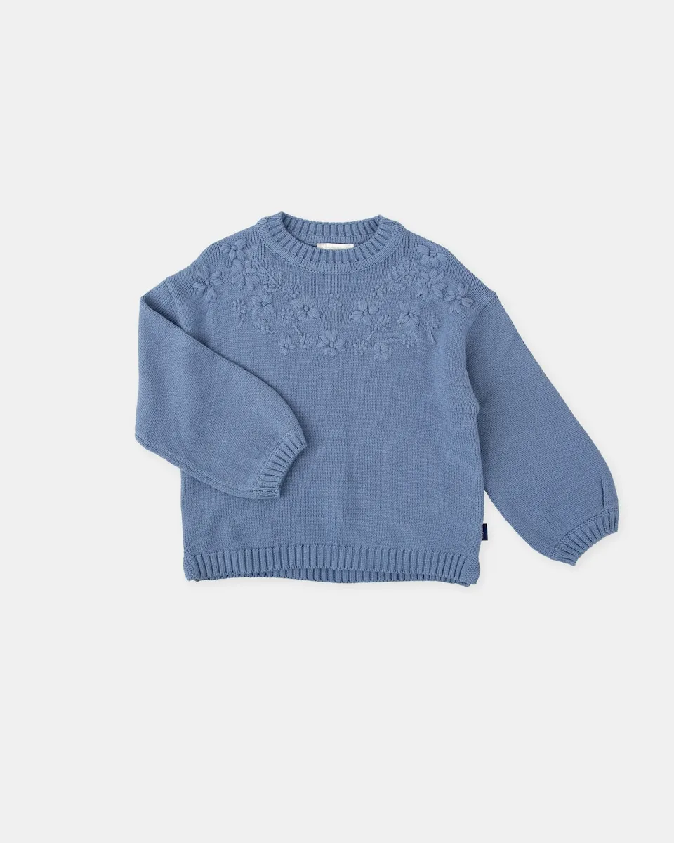 Вязаный свитер синего цвета с деталями в виде цветов спереди.