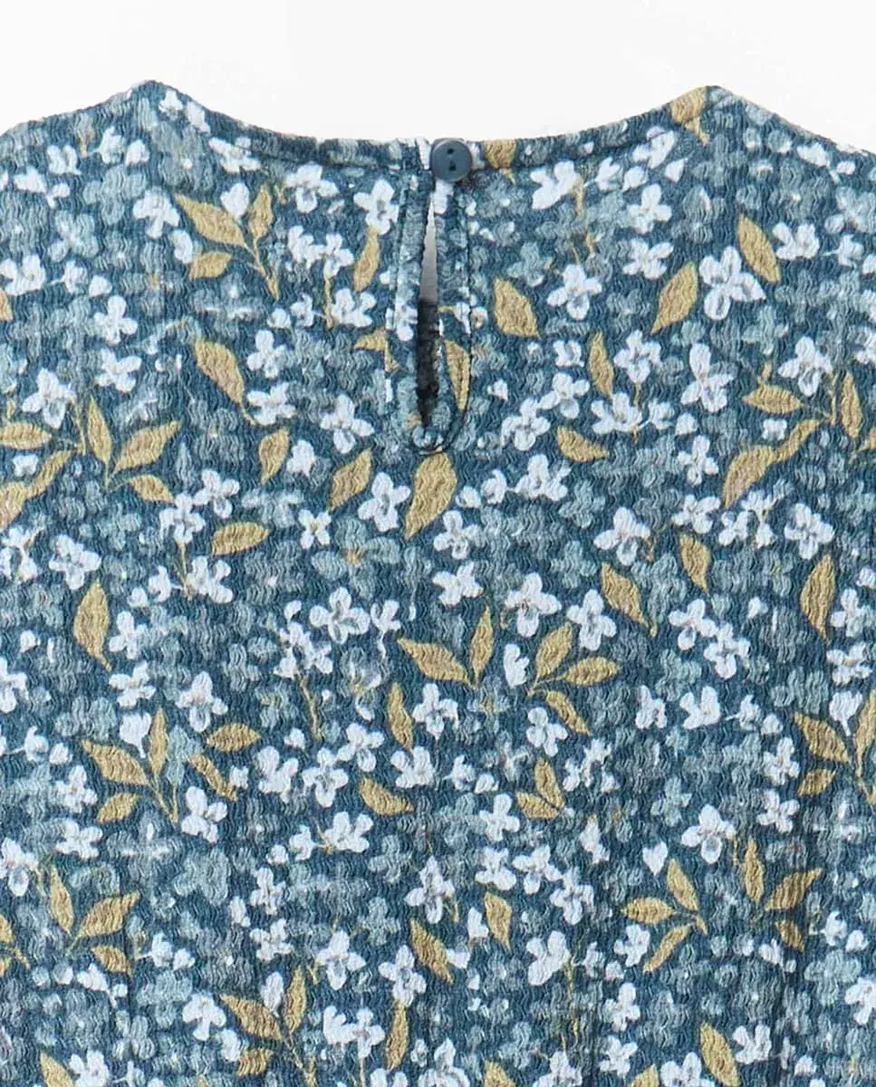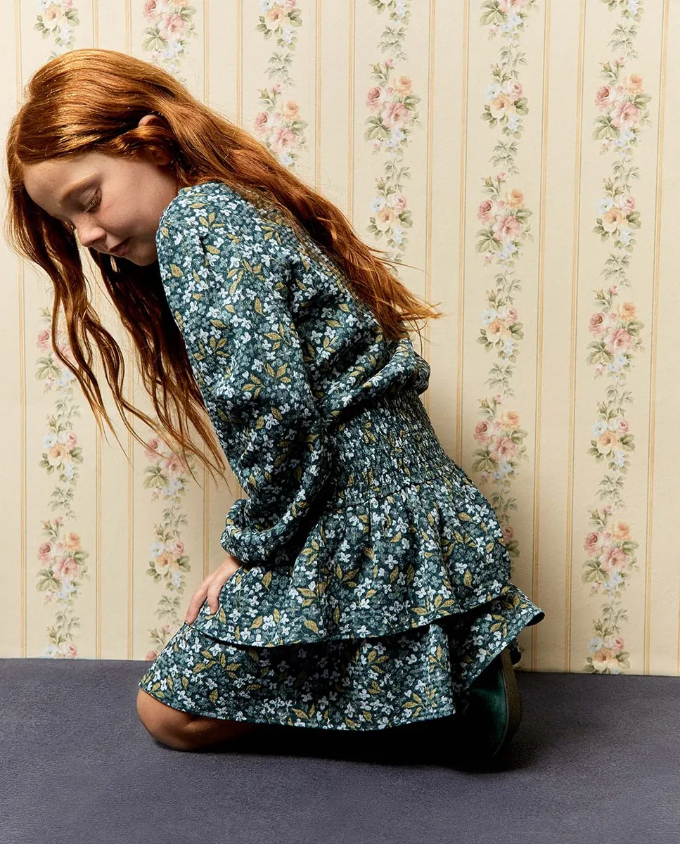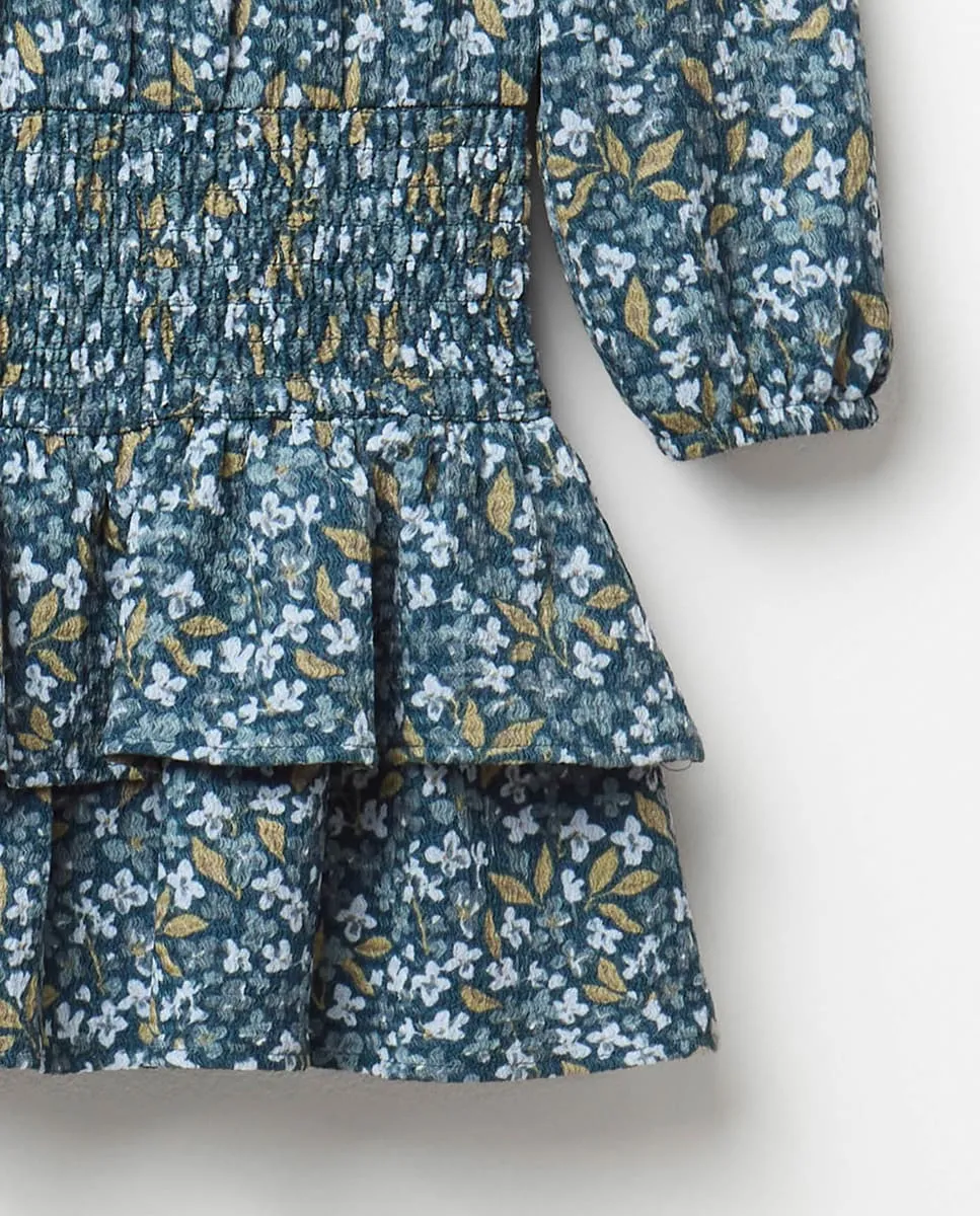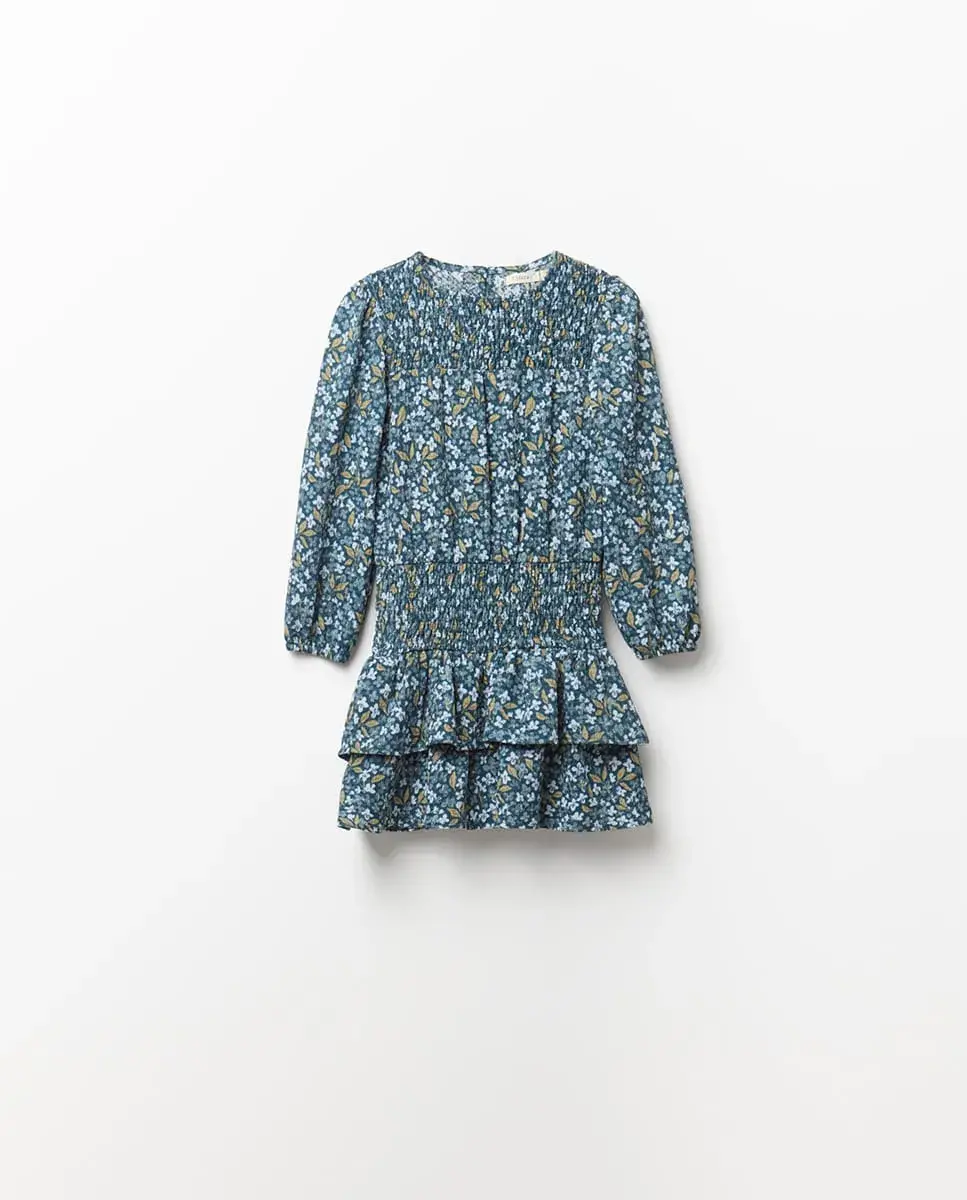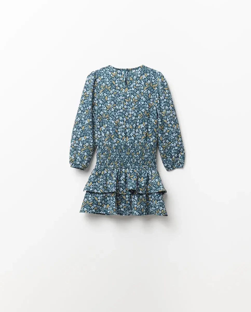 Платье с длинными рукавами и резинкой на бедрах. Застежка сзади на пуговицу.