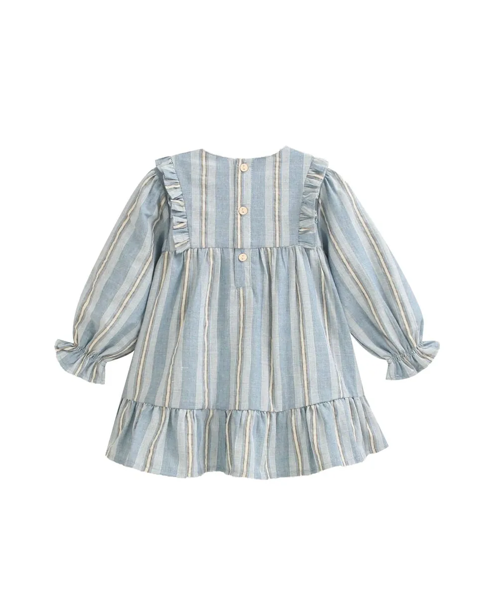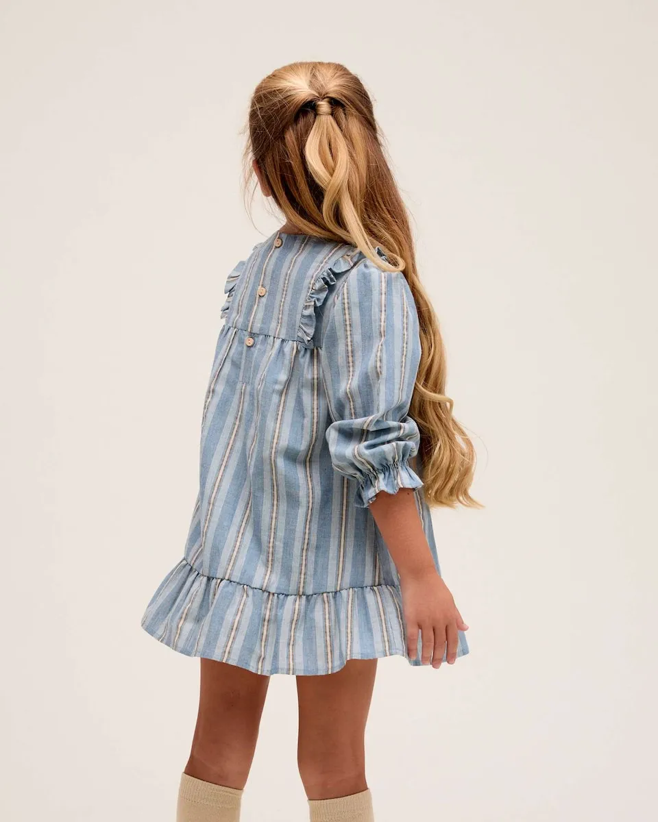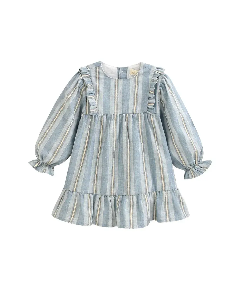 Платье для девочки с расклешенным кроем, полосатое, белое и золотое с блеском, с длинным рукавом, круглым вырезом, оборками спереди и застежкой на спине.