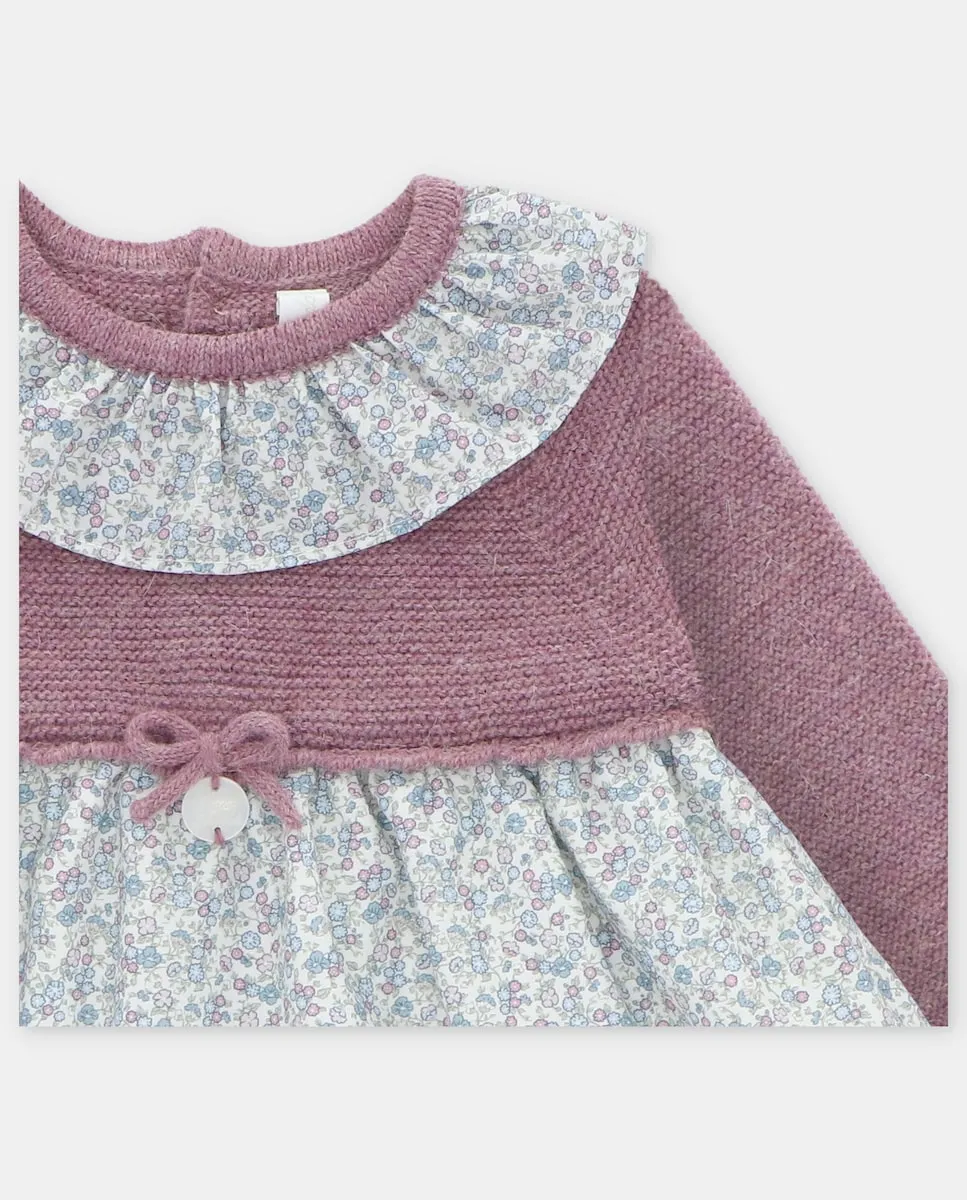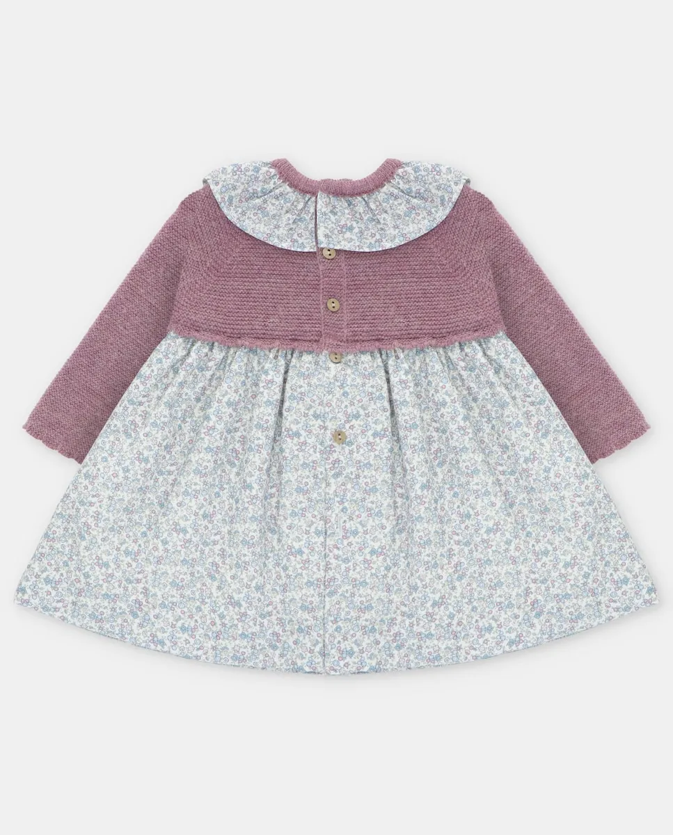 Комбинированное вязаное платье для младенца с микропринтом цветов, воротником с оборкой, выполненным комбинированной вязкой, пуговицами из кокоса и круглой пластиной с бантом из шнурка, цвета лаванды. Изготовлено в Испании.