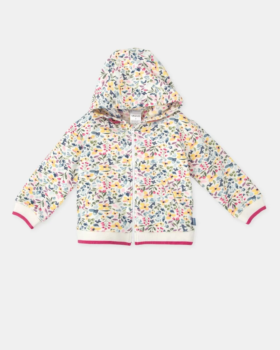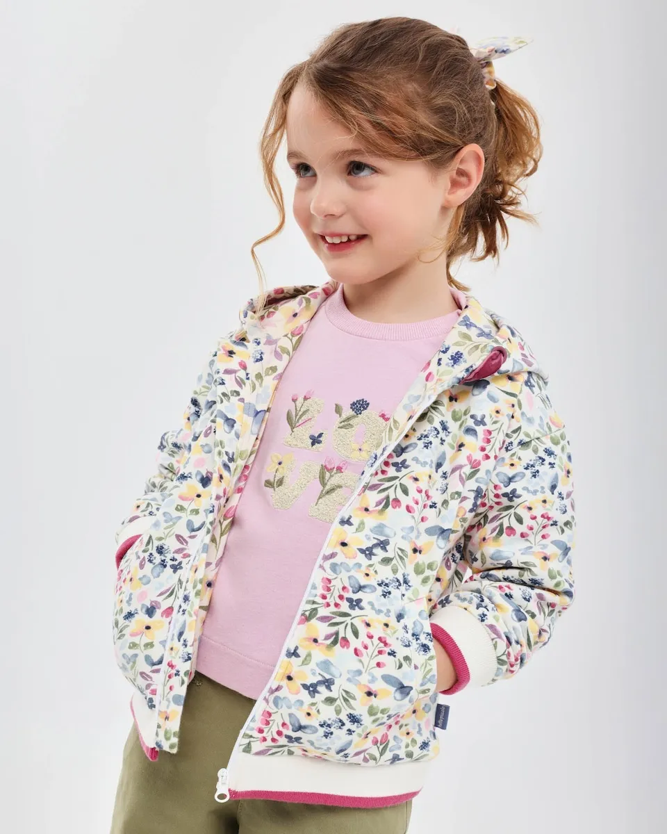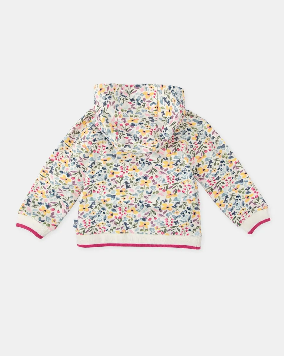 Свитшот из флиса с эластаном с цветочным принтом пурпурного цвета. С капюшоном и карманами. Ребристая отделка на манжетах и подоле. Спереди застежка на молнии.