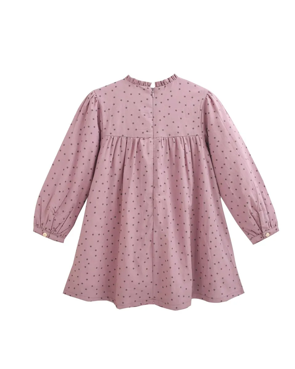 Платье для девочки с расклешенной юбкой и звездочками, со сборками на воротнике, пышными рукавами и внутренней подкладкой, застежка на спине с потайной молнией.