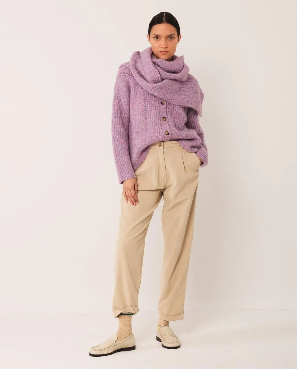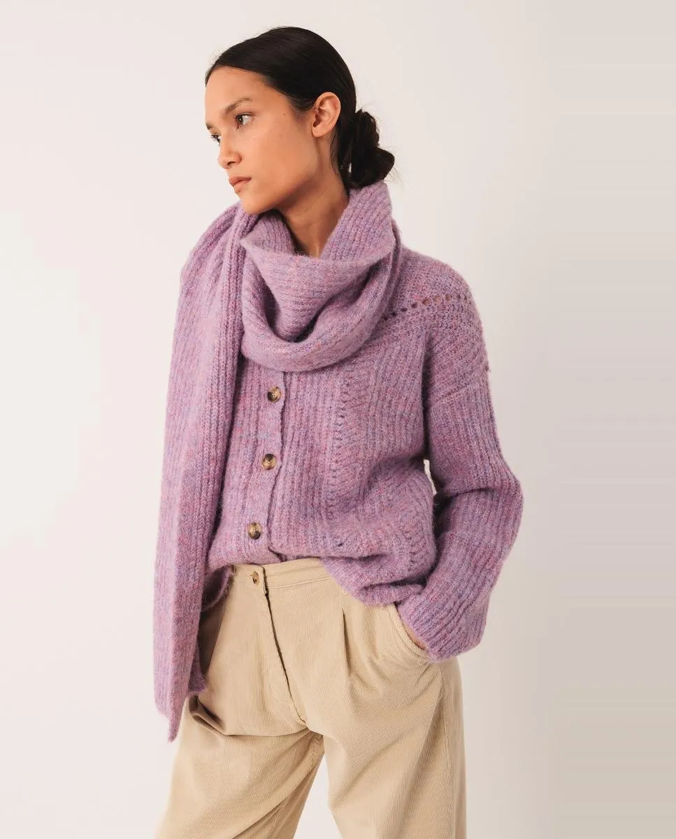 Длинный вязаный шарф из пряжи с переработанными волокнами.
