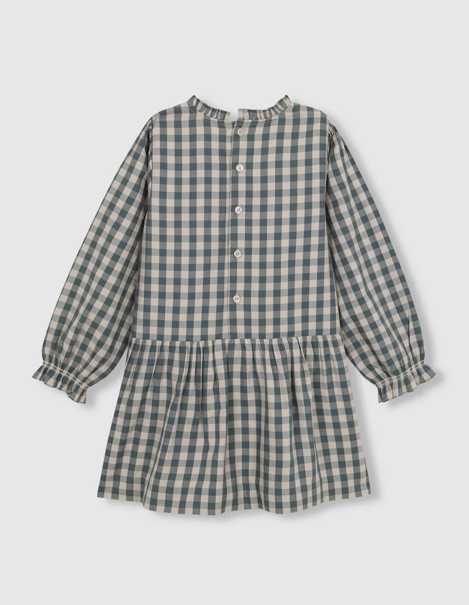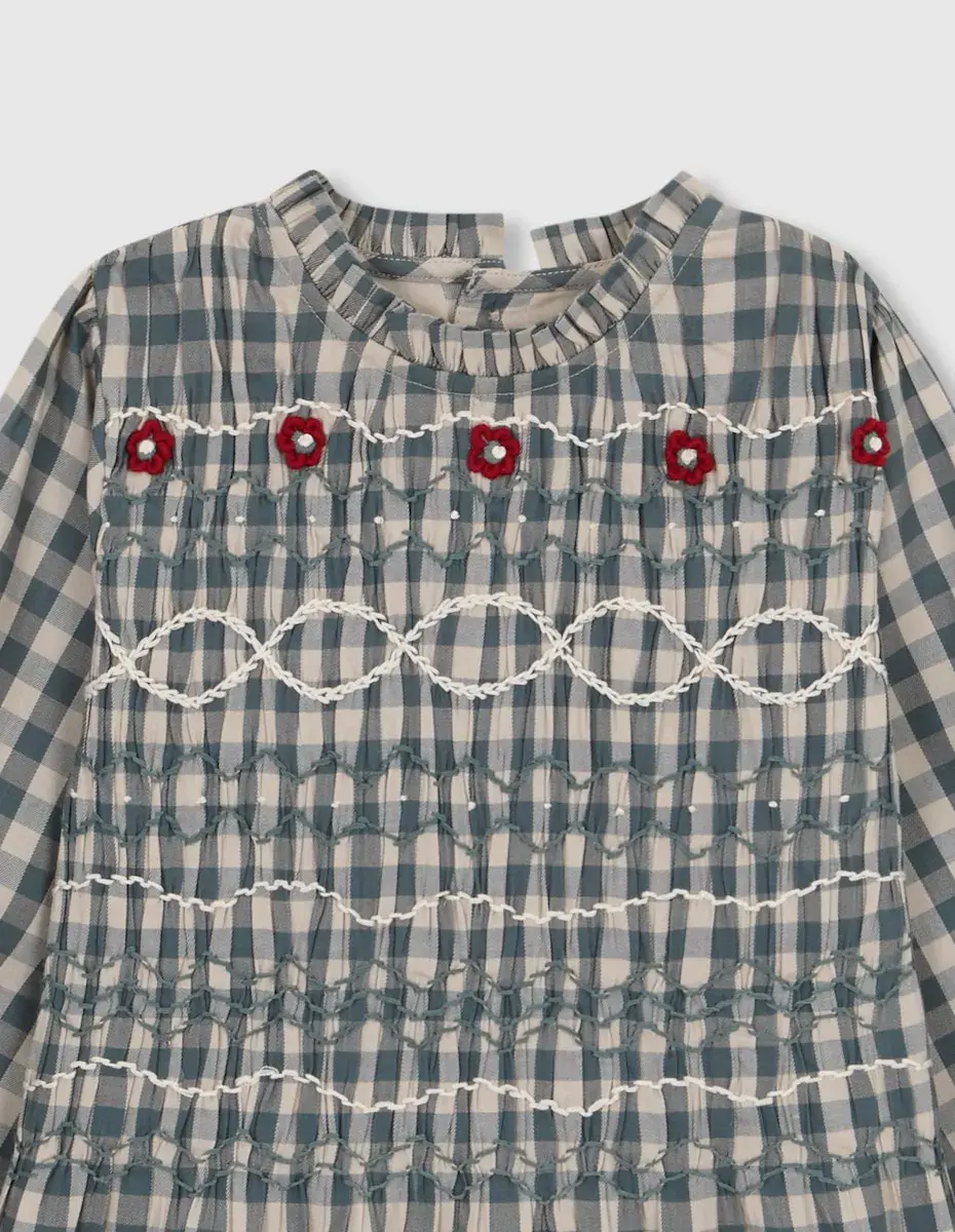 Платье в клетку с вышивкой на передней части, слегка присборенные рукава и застежка на спине.