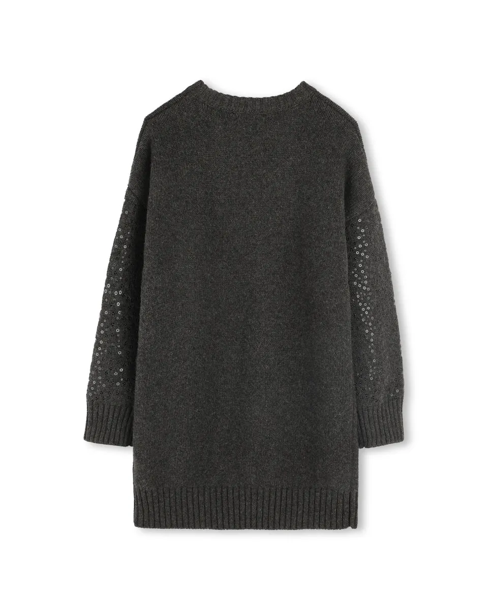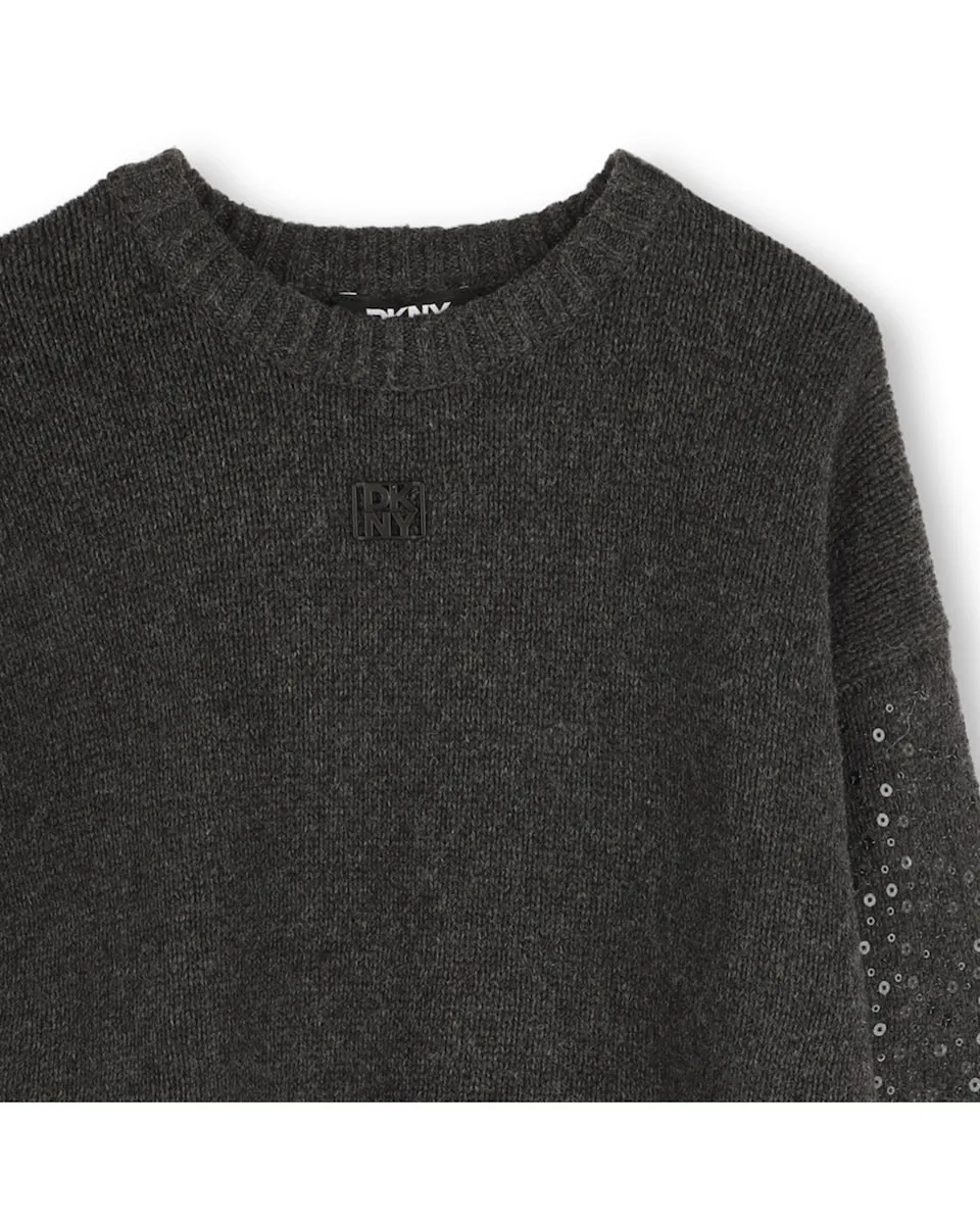 Элегантное и современное, это трикотажное платье DKNY Mini-me идеально подходит для стильного образа. Сшитое из смеси хлопка, полиамида и шерсти, оно обеспечивает комфорт и мягкость. Вышитые блестки на рукавах добавляют сияющий акцент, а металлическая пластина на передней части придает изысканную деталь этому элегантному и практичному дизайну.