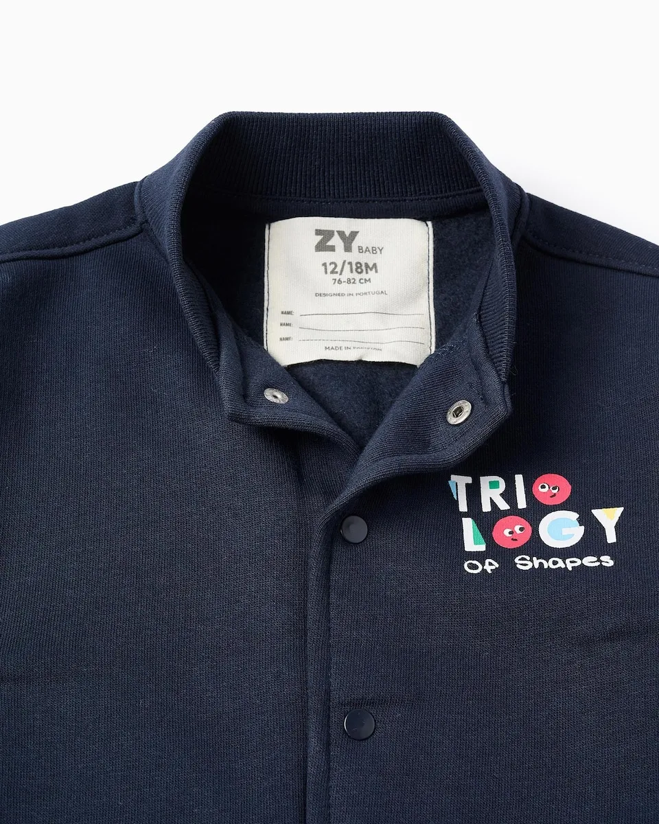 Бомбер для маленького мальчика, изготовленный из хлопковой смеси, с ворсистой подкладкой для дополнительного тепла. Туловище темно-синее, рукава бежевые. Небольшой принт на груди, вдохновленный движением Баухаус. Манжеты ребристые и эластичные, с полосатым эффектом, темно-синие и красные. Застежка на кнопки. Боковые карманы. Внутренняя бирка для написания имени ребенка. Мягкая и уютная куртка, чтобы выглядеть стильно!