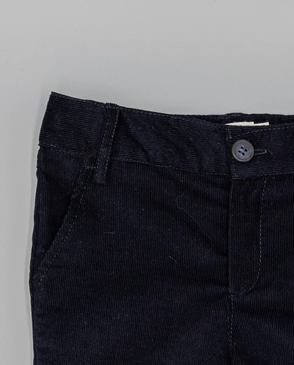 Синие вельветовые брюки для мальчика с внутренней резинкой и пуговицей для регулировки на поясе. Прямые боковые карманы и накладные карманы сзади. Доступны размеры от 2 до 14 лет.
