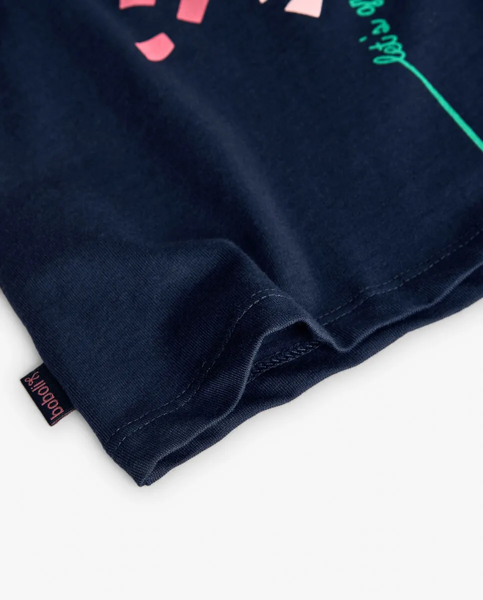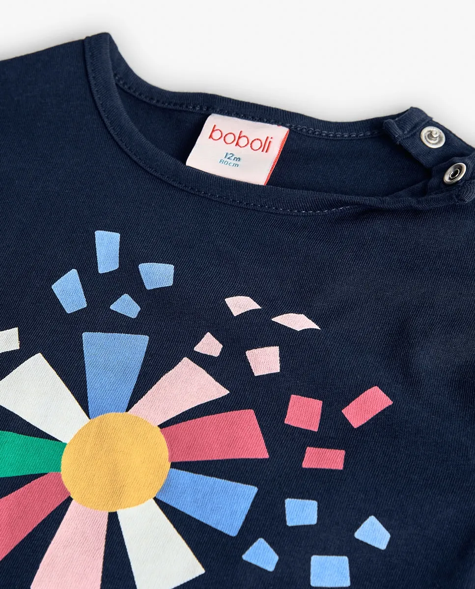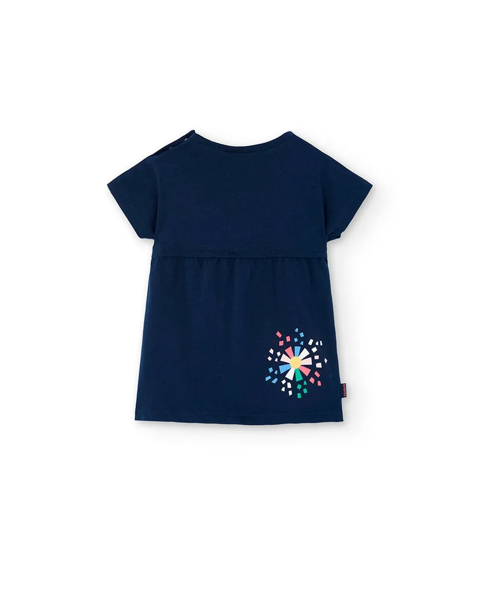 Это платье для девочки, идеально подходящее для весенне-летнего сезона. Сделано из мягкого хлопка, обеспечивает комфорт и прохладу. Темно-синего цвета с цветочным принтом и геометрическими фигурами в ярких цветах, таких как розовый, синий и зеленый, что придает ему веселый вид. Дизайн с круглым вырезом и короткими рукавами идеально подходит для теплых дней. Доступно в размерах от 12 месяцев до 10 лет. Это платье универсально и легко сочетается с различными стилями для повседневной носки.