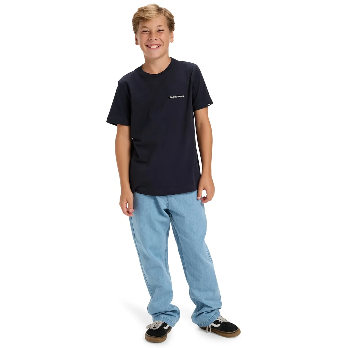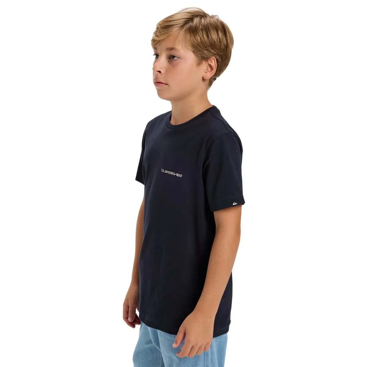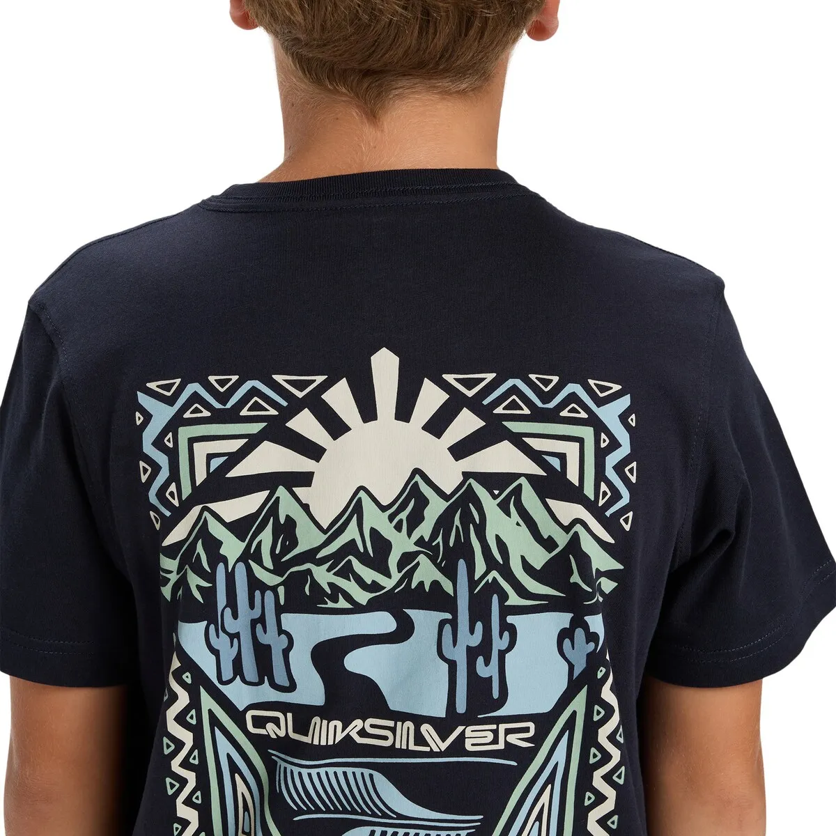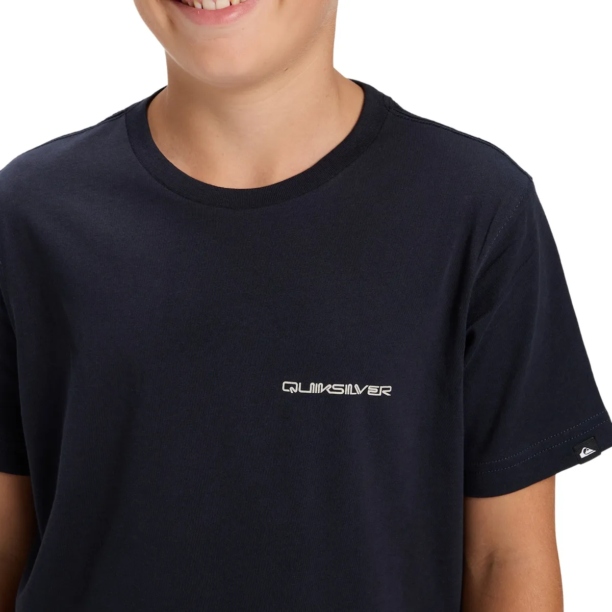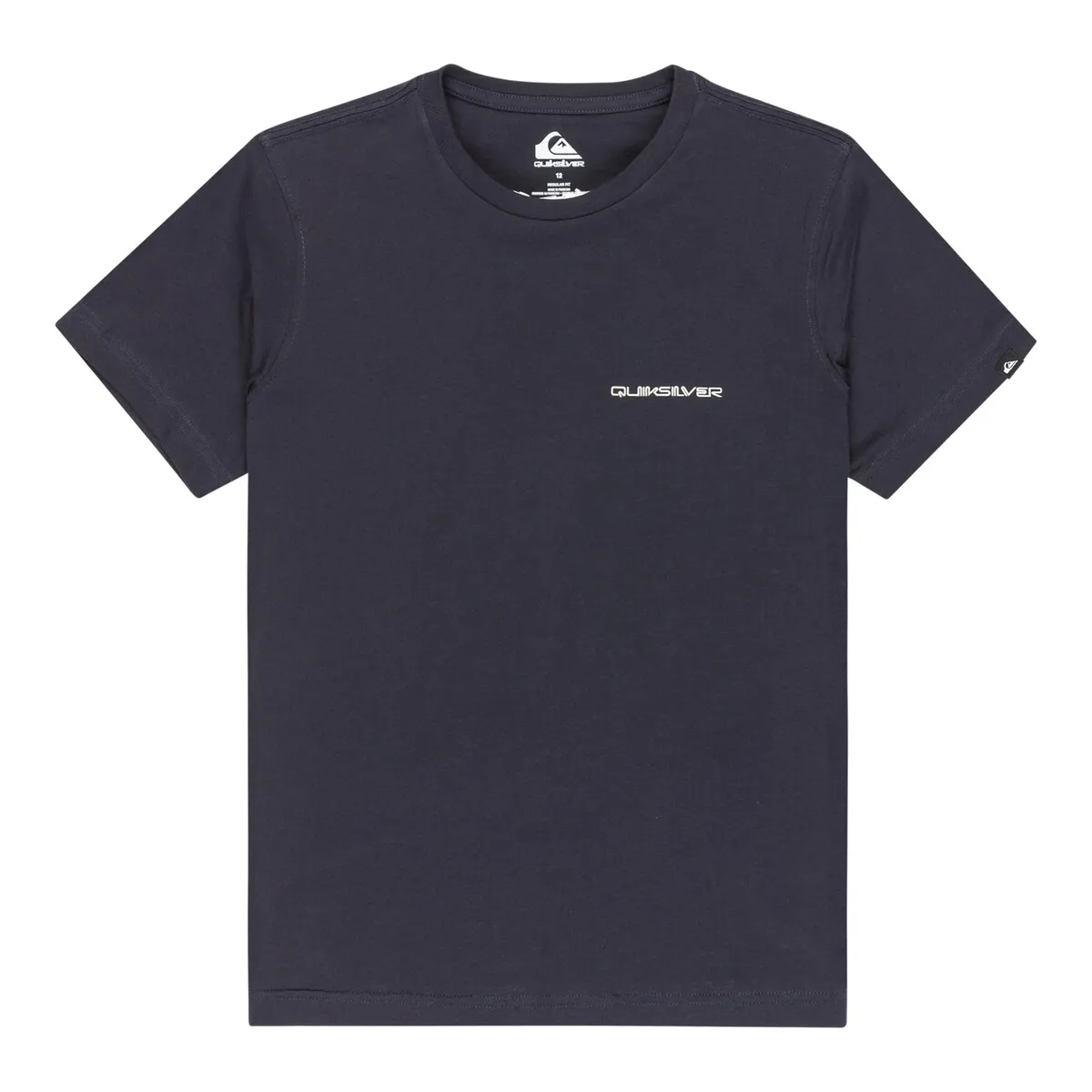 Футболка с короткими рукавами для детей 8-16 лет. Характеристики включают: Материал: хлопковый трикотаж [160 г/м²], Крой: обычный, Воротник: круглый, Принт на груди и спине, Бирка Quiksilver на подоле рукава.