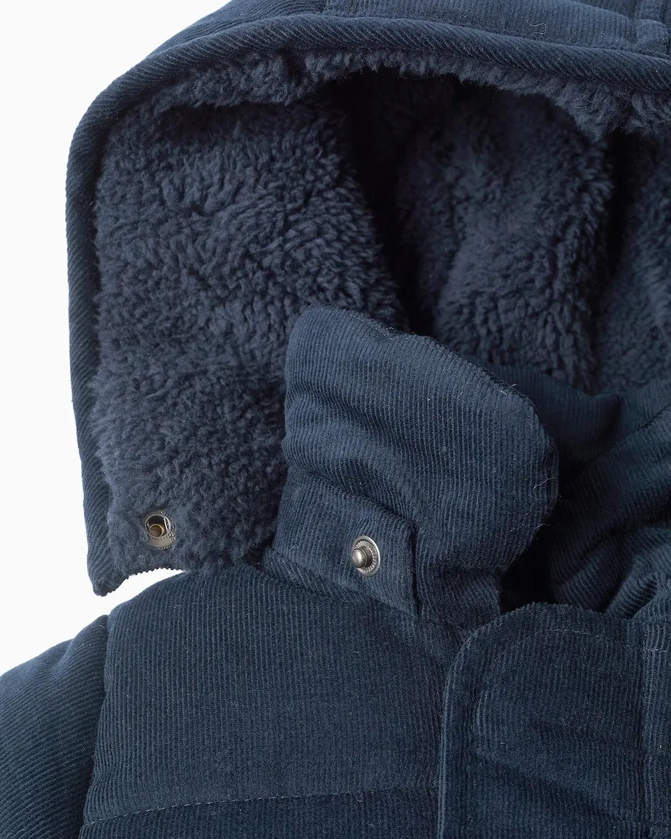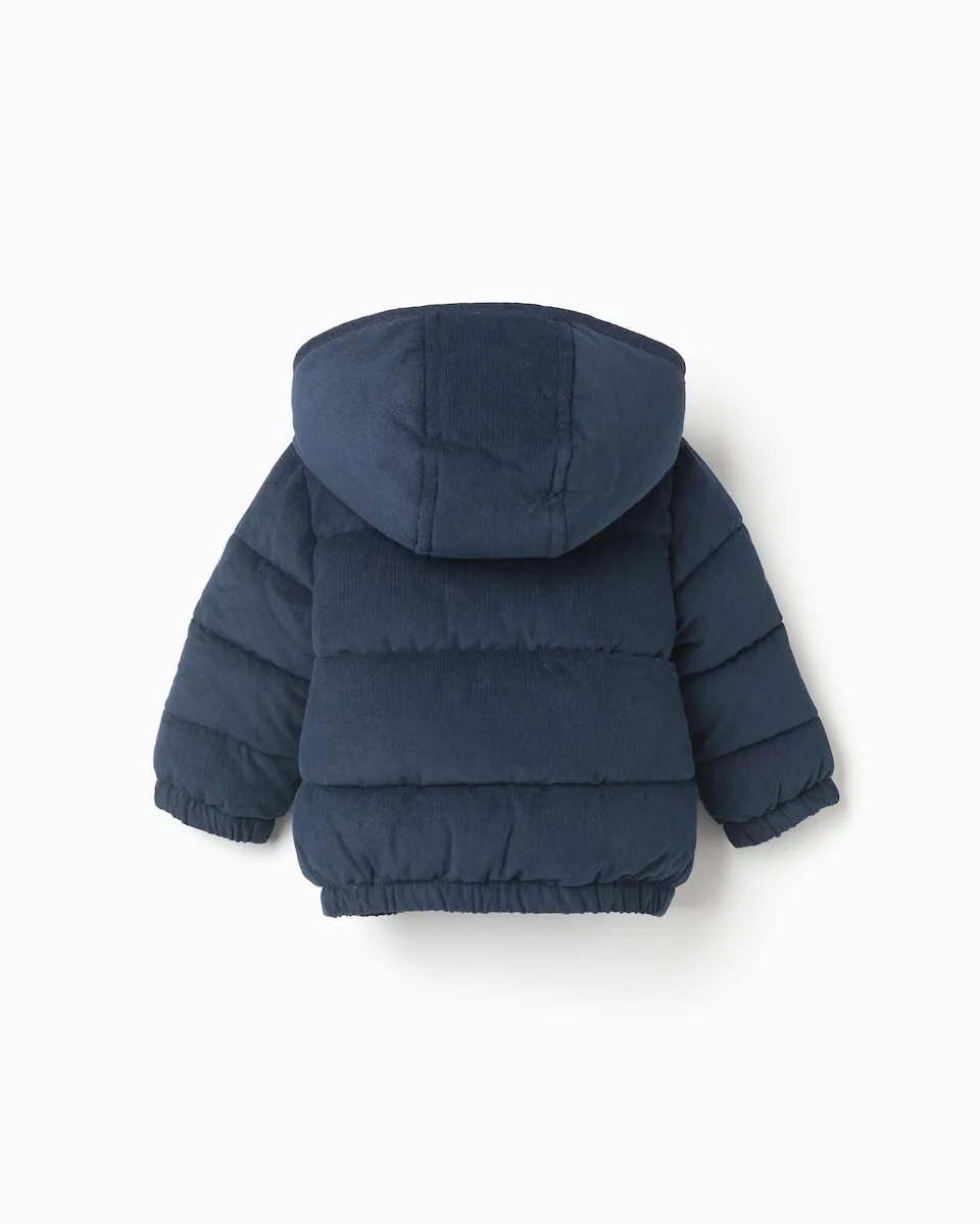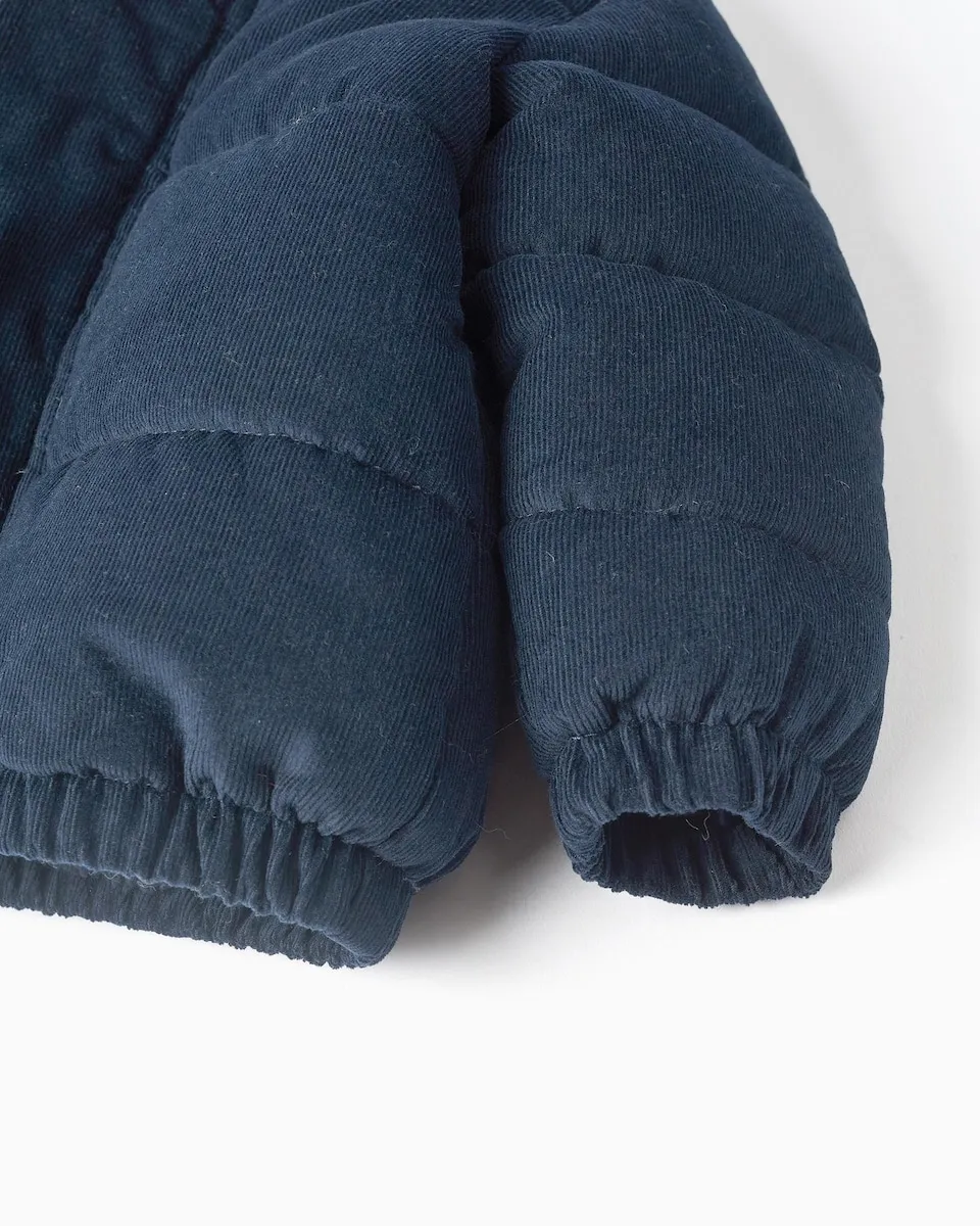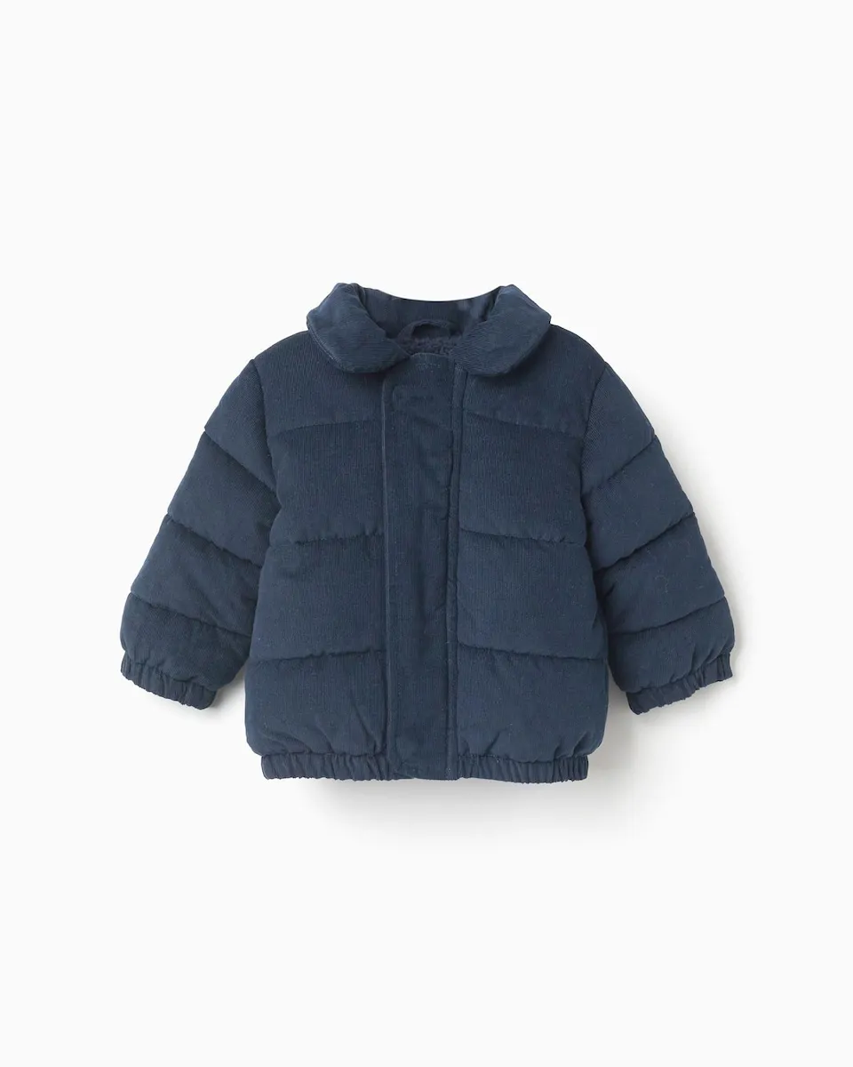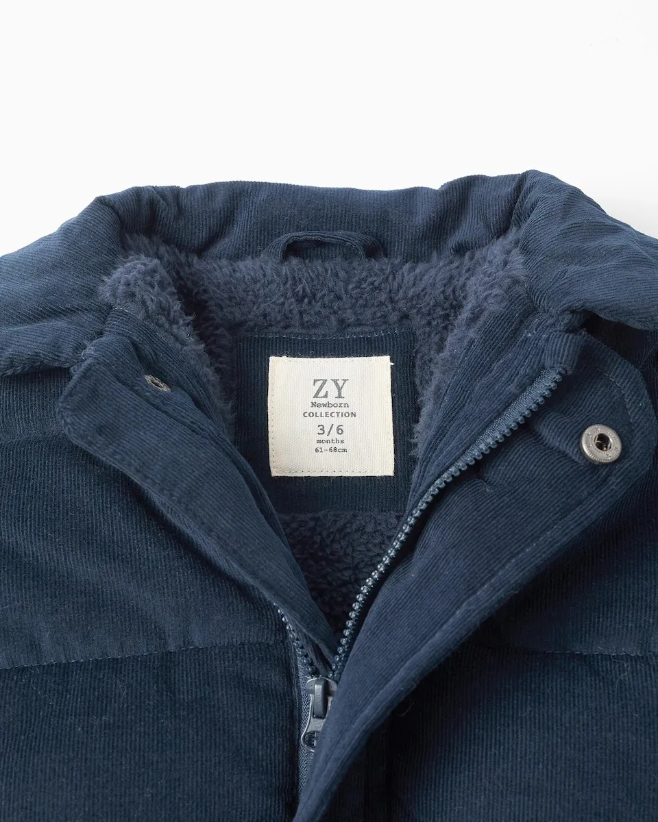 Темно-синяя стеганая куртка для новорожденного. Из вельвета 100% хлопок. Съемный капюшон. Подкладка из искусственного меха для дополнительного комфорта. Воротник Питер Пэн. Застегивается спереди на молнию и две кнопки. Эластичная нижняя часть и манжеты для идеальной посадки. Идеальная зимняя куртка для вашего малыша!