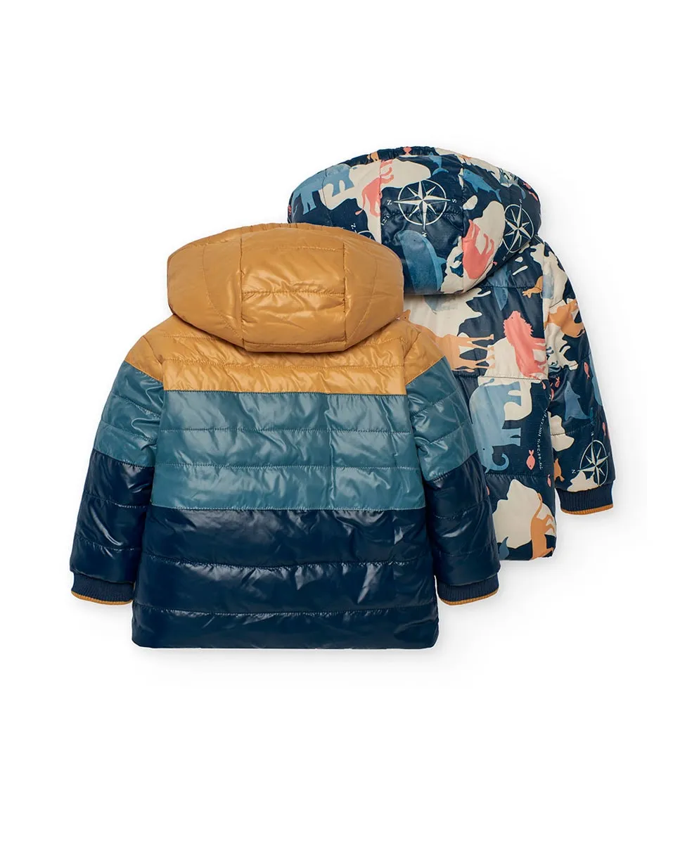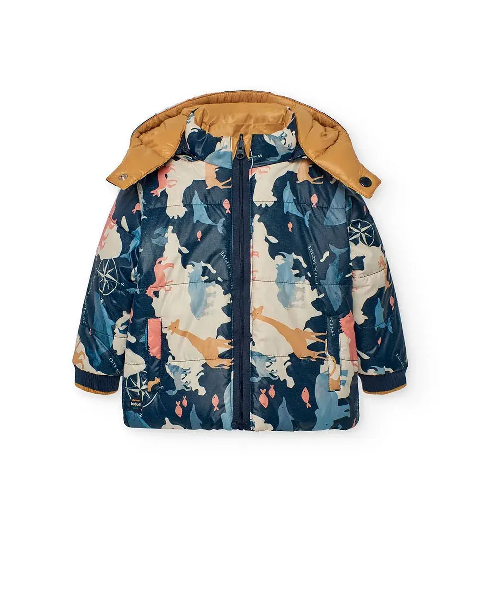 Двусторонняя парка темно-синего цвета, идеально подходящая для осени и зимы, с внутренним принтом с животными, который позволяет легко менять стиль. Съемный капюшон и фронтальная молния обеспечивают защиту и комфорт от холода. Изготовлена из материалов, устойчивых к погодным условиям, обеспечивает тепло в самые холодные дни. Доступна в размерах от 12 месяцев до 10 лет, идеально сочетается с повседневной одеждой, гарантируя, что малыши будут тепло одеты и стильно выглядеть во время игр на свежем воздухе.