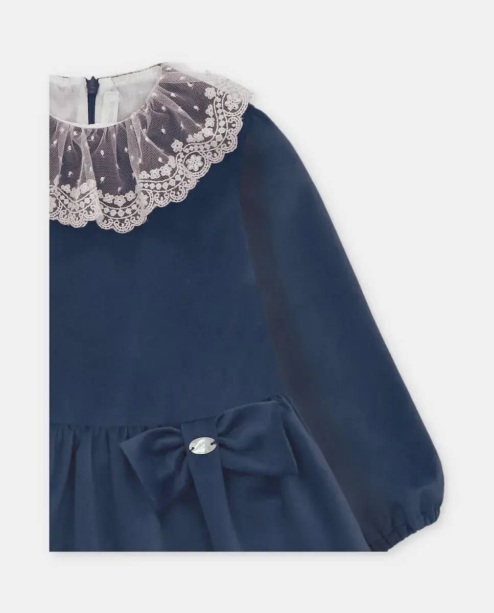 Бархатное платье для младенцев, с воротником-воланом из вышитого тюля, застежка сзади на невидимую молнию в тон, бархатный бантик с овальной пластиной, темно-синего цвета. Сделано из 100% полиэстера. Произведено в Испании.
