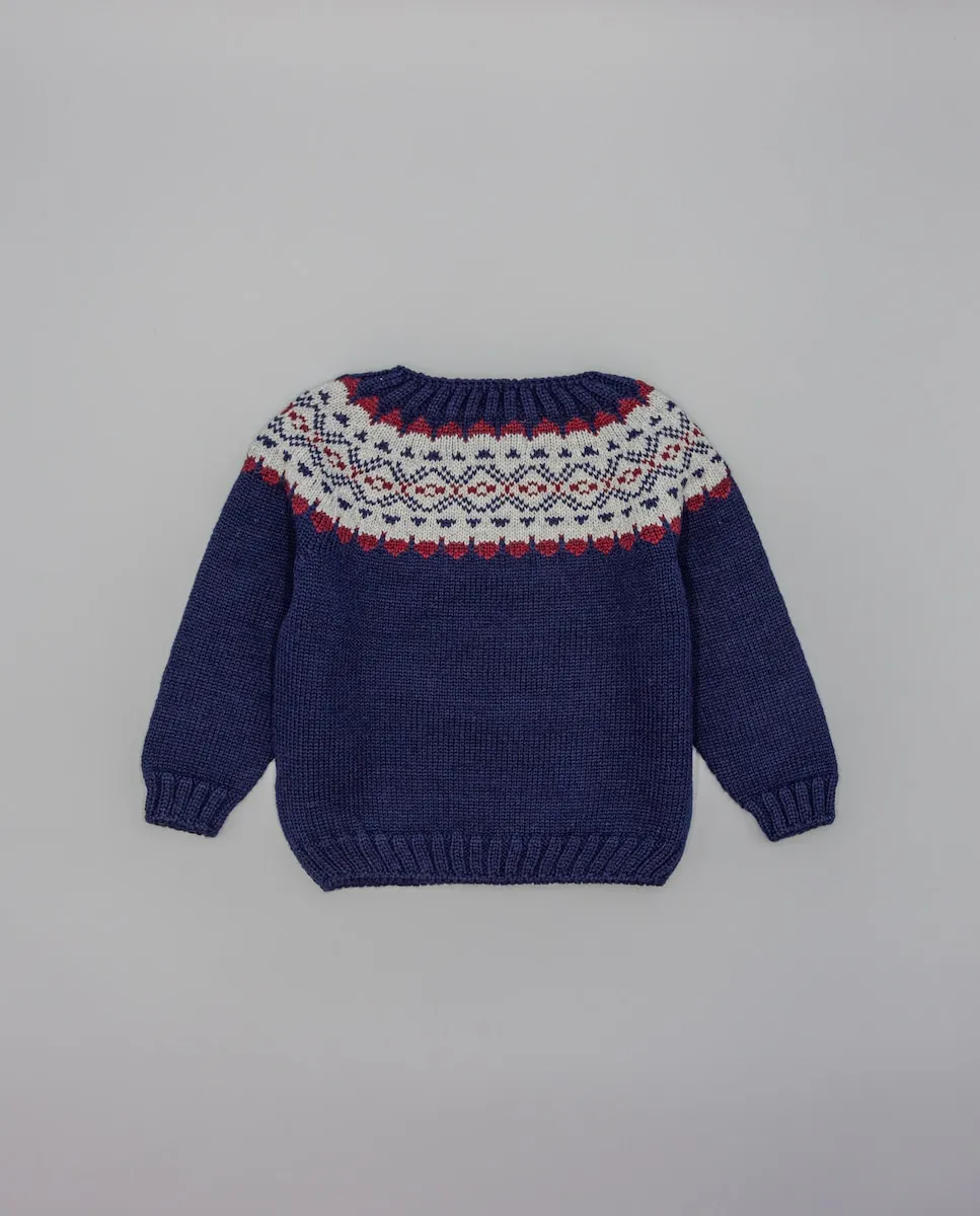 Свитер темно-синего цвета с узором в кремовых и бордовых тонах. Выполнен бесшовным способом для большего комфорта. Отделка горловины, манжет и низа выполнена в рубчик. Идеально подходит для холодных дней. Доступен в размерах от 3 месяцев до 12 лет.