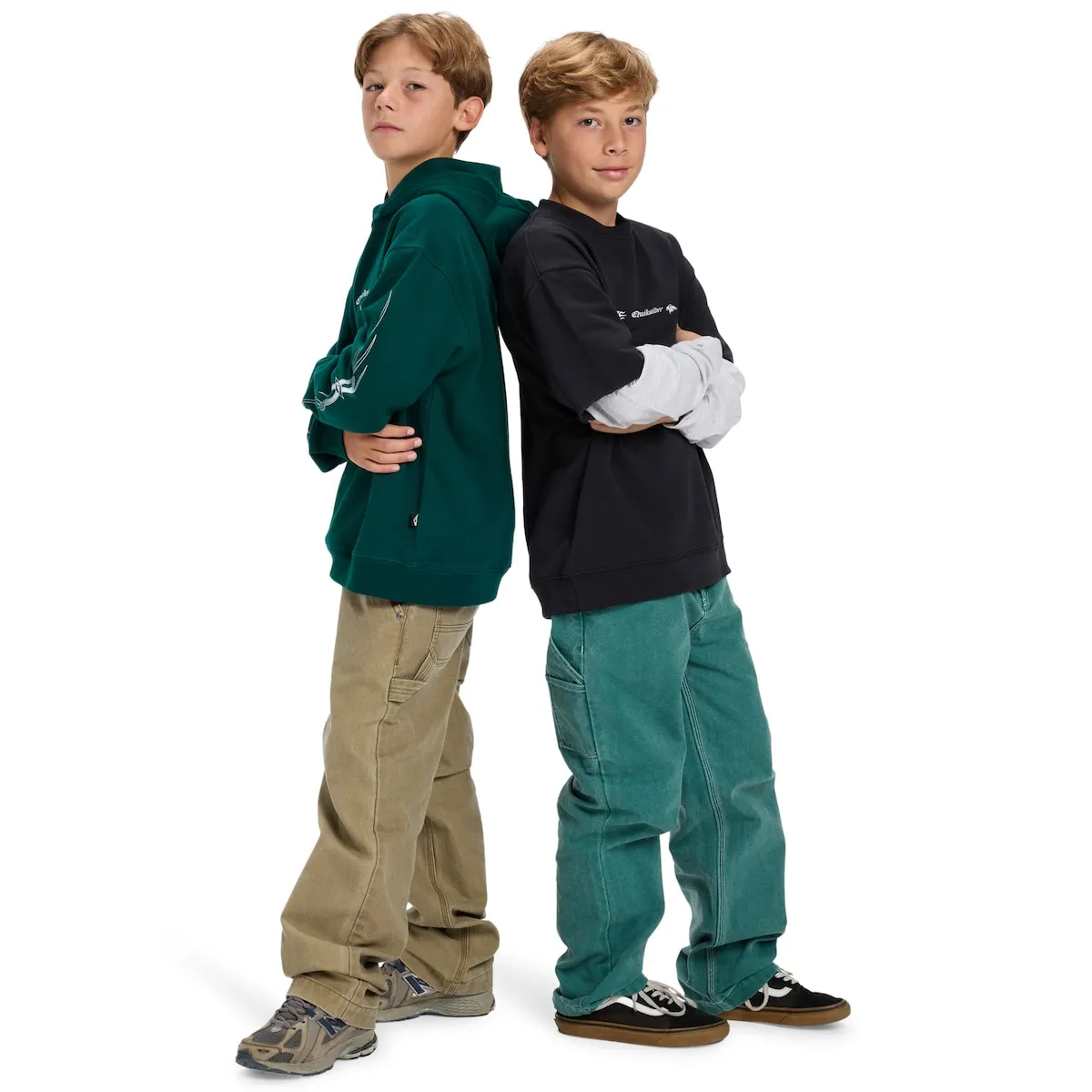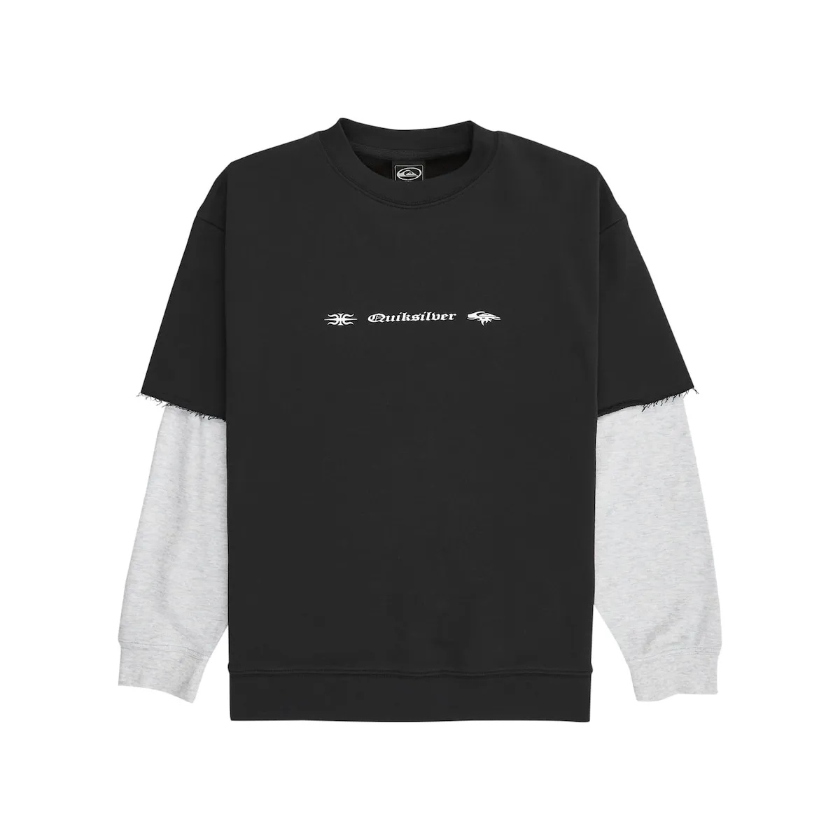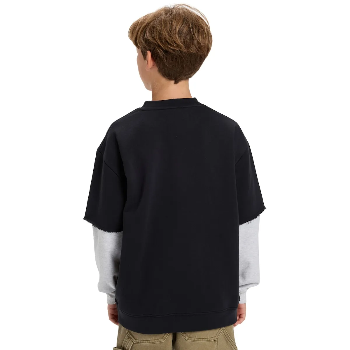 Футболка с имитацией слоев для детей 8-16 лет. Характеристики включают: Ткань: обычный хлопковый флис с переработанным хлопком и полиэстером, лицевая сторона обработана щеткой [370 г/м2], Крой: свободный, Вырез: круглый, Рукава: рельефный хлопок в слоях, Принт: шелкография на груди с мягкой текстурой и ярлык Quiksilver на боковом шве.