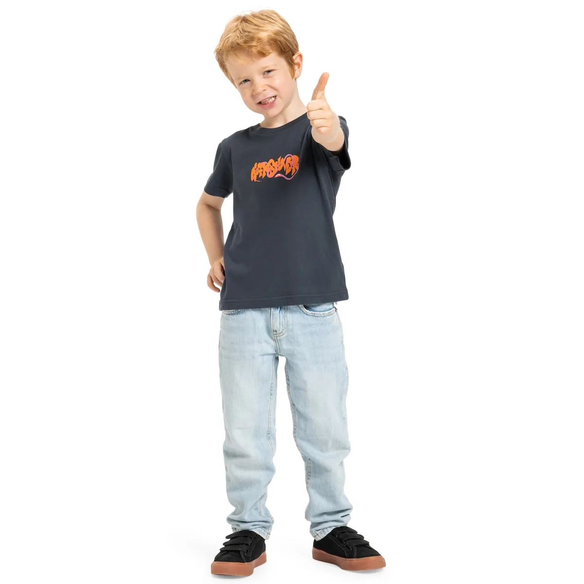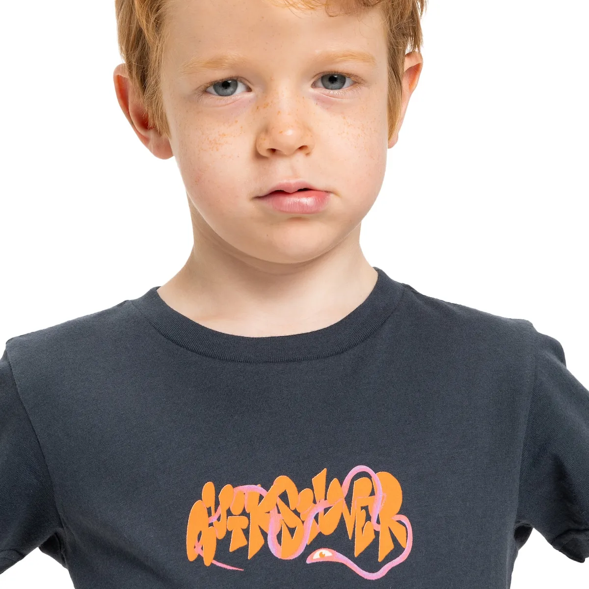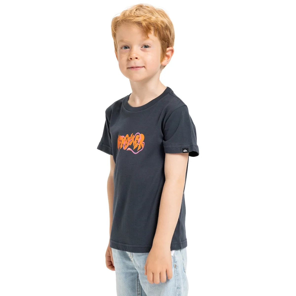 Футболка с короткими рукавами для детей. Особенности включают: Ткань: трикотажный хлопок [160 г/м2], Крой: обычный, Воротник: круглый вырез, Принт на груди и спине и ярлык Quiksilver на подоле рукава.