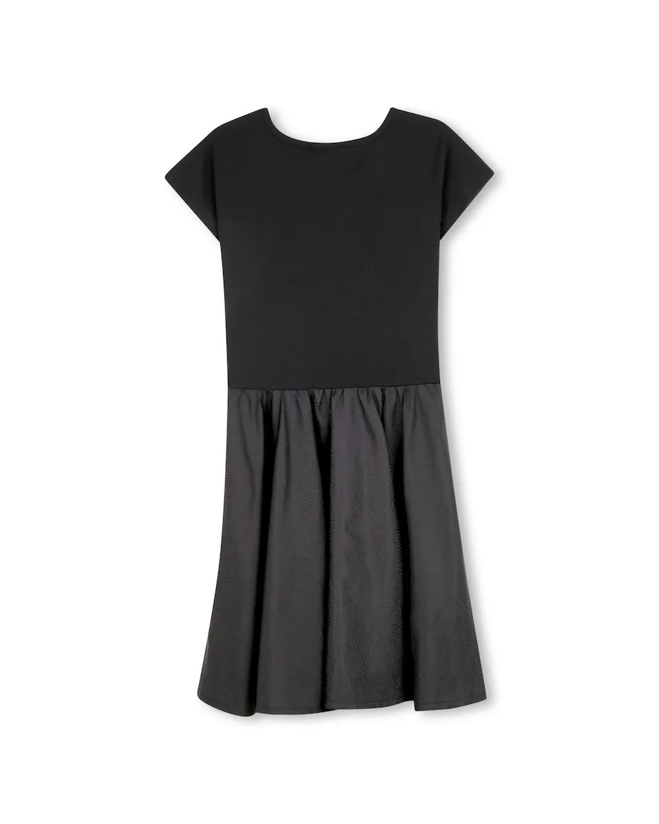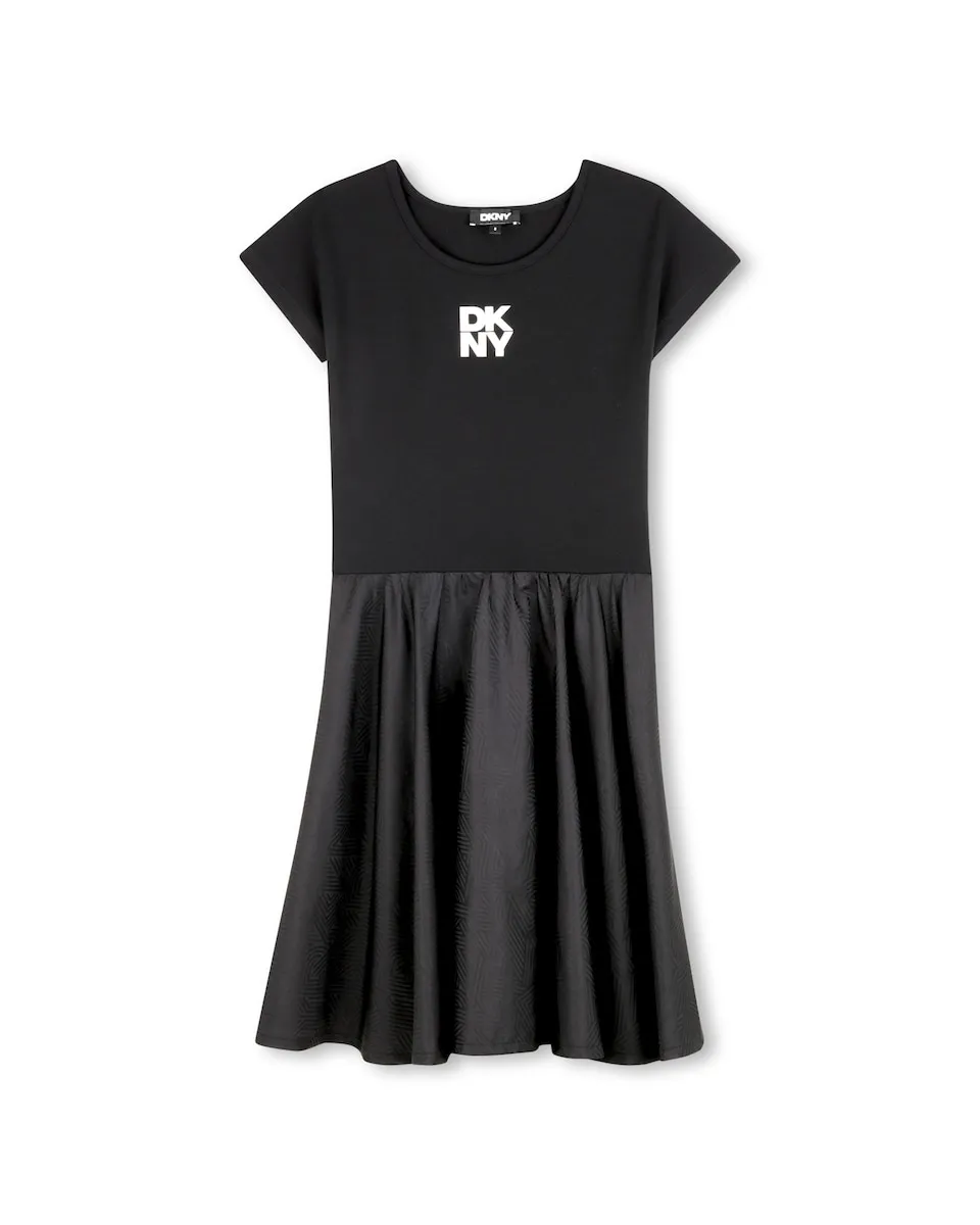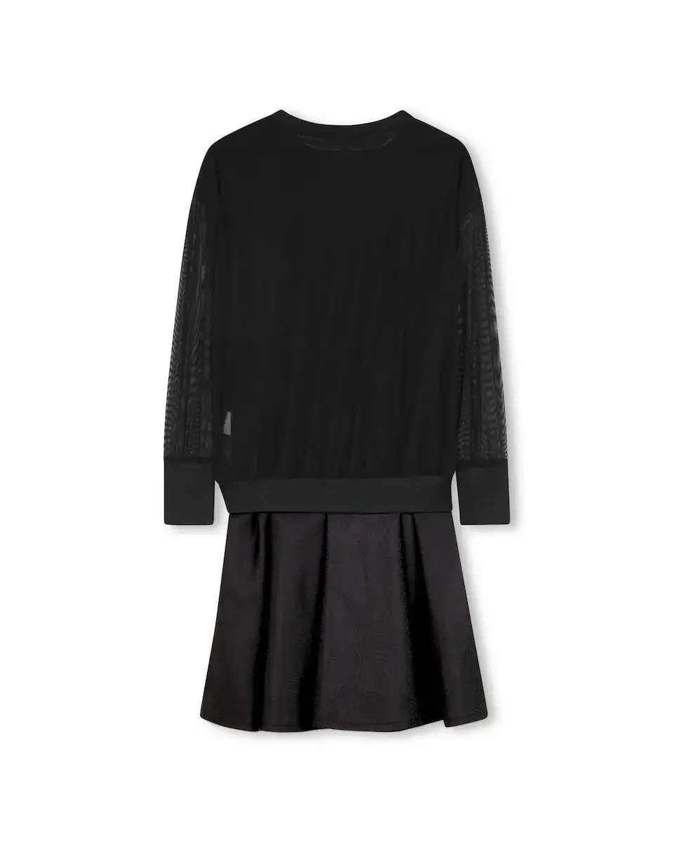 Это платье DKNY 2 в 1 идеально подходит для современного и практичного образа. Верх из джерси обеспечивает комфорт и гибкость. Иллюстрация на груди добавляет стильный штрих, а подол с принтом «crosswalk» Mini-me в жаккарде на полиамидной основе и топ из тюля с длинными рукавами, дополненный металлической пластиной, придают элегантность и современность.