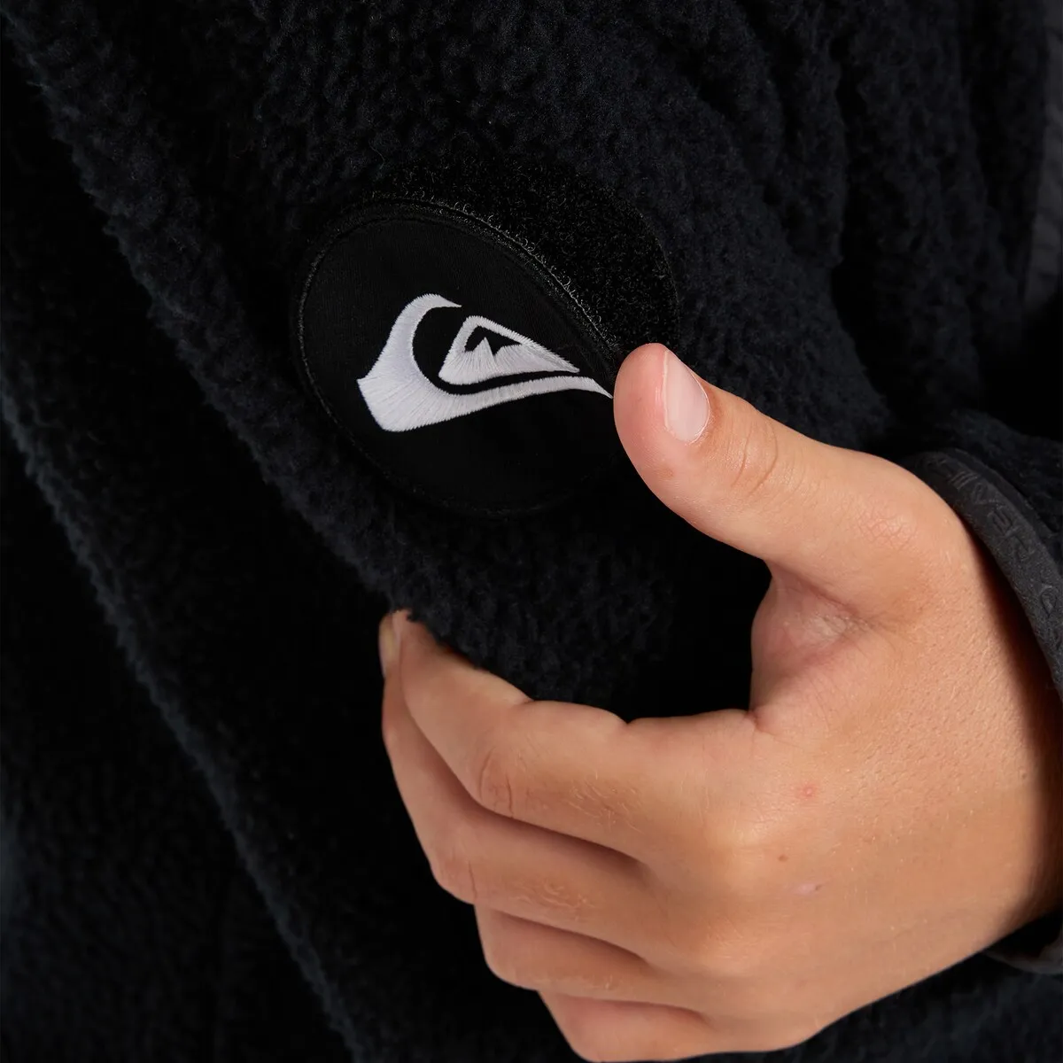 Флисовая куртка на молнии для детей 8-16 лет. Характеристики включают: Ткань: переработанный полиэстер, Покрой: оверсайз, Накладывающийся капюшон и кокетка, Карманы-кенгуру, Карман на груди на молнии, Дополнительные детали: бренд Quiksilver и съемная специальная нашивка на липучке.
