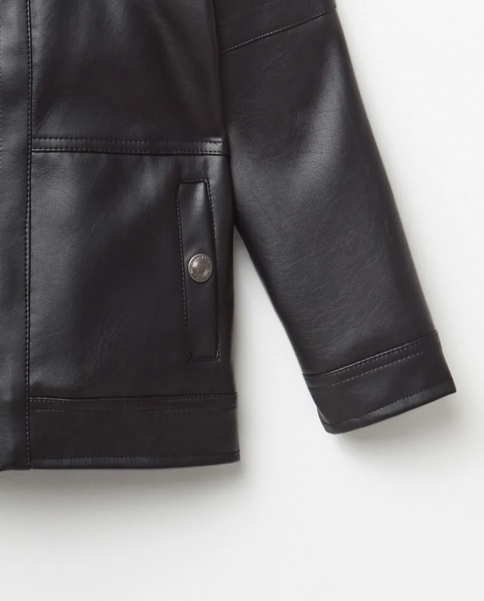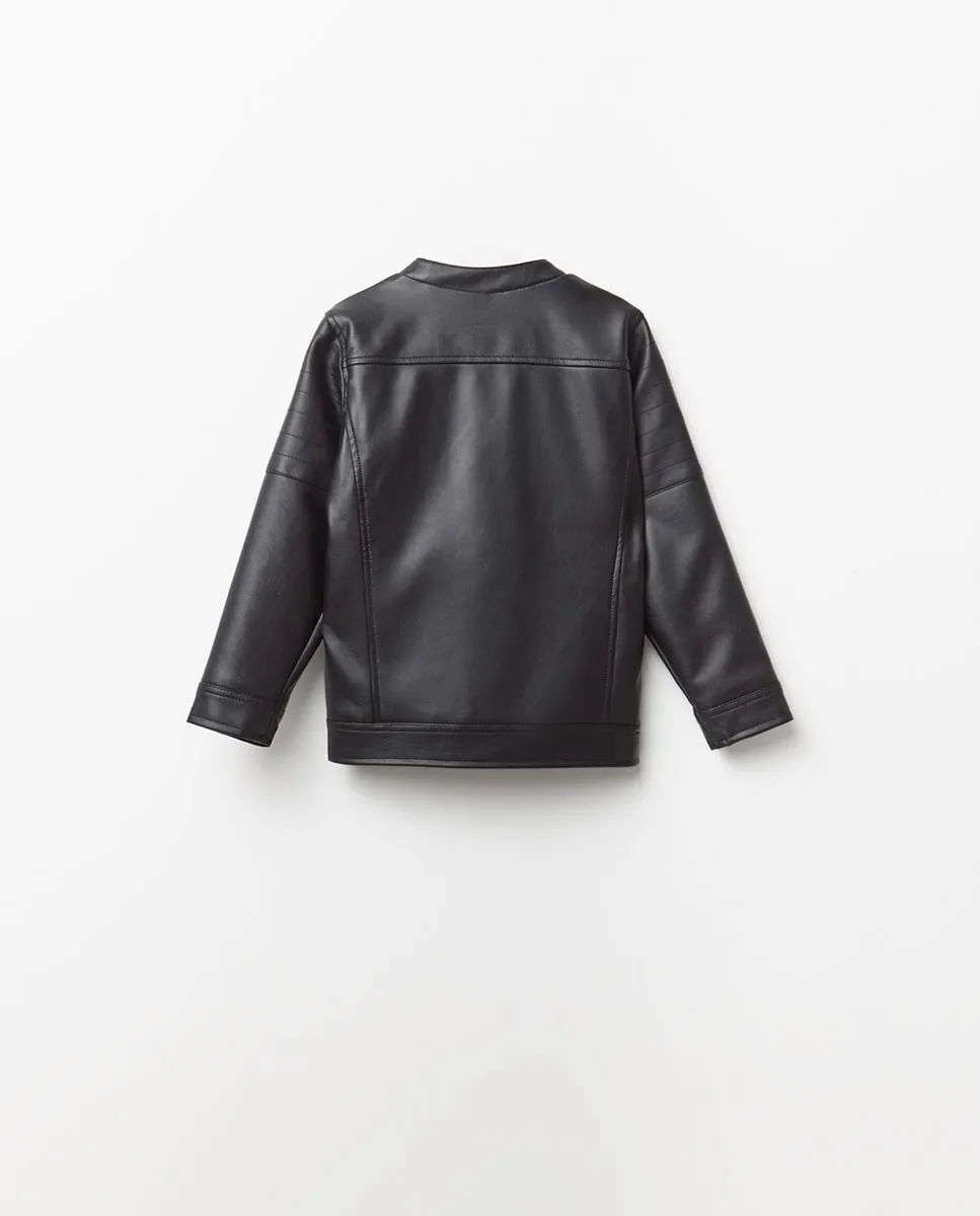 Спортивная куртка из кожи с эффектом байкера с воротником-стойкой и передней застежкой на молнию и крючок на воротнике. Карманы