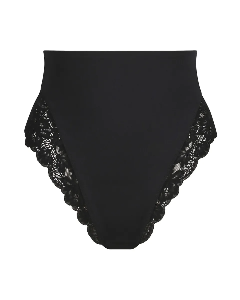 Трусики с высокой талией, которые сочетают в себе комфорт и стиль с мягким моделирующим эффектом, идеальны для повседневного ношения. Детали из кружева на бедрах придают элегантность, а зигзагообразные швы по краям обеспечивают гибкость и предотвращают появление следов. Их дизайн удобный, женственный и идеально подходит для ношения под обтягивающей одеждой.