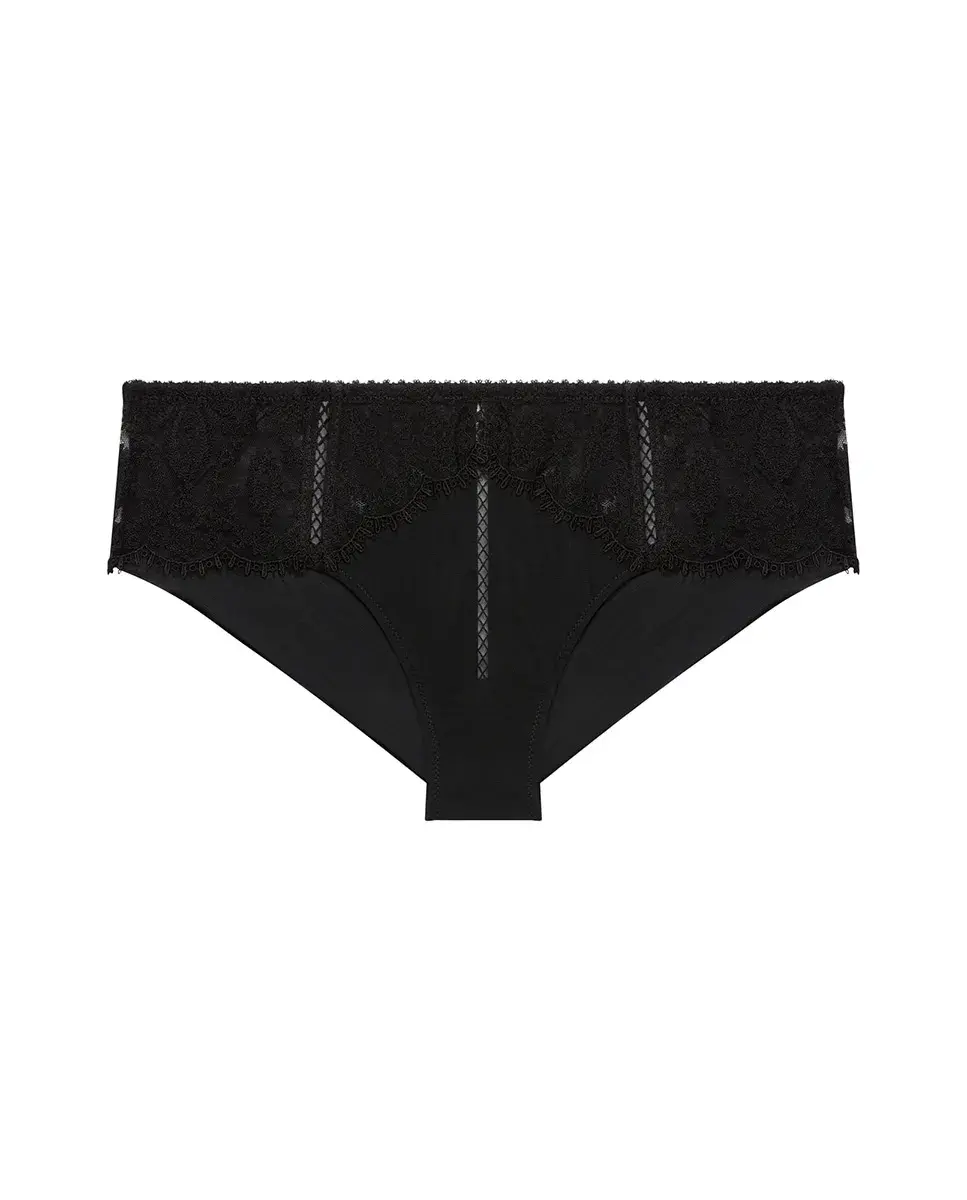 Шорты с передней частью из тюля с вышивкой, кружевные фестоны в верхней части бедер и лестничный вырез на вертикальных разрезах. Задняя часть выполнена из двойного тюля для невидимого ношения. Элегантная резинка на талии. Основа 100% хлопок. Экологичная линия SIMONE CARES: вышивка содержит 100% переработанных волокон.