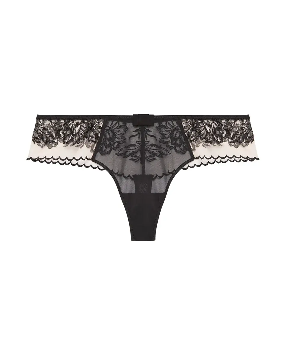 Трусики-танга с передней частью из тюля с вставками из вышивки по бокам и с отделкой в виде фестонов, задняя часть полностью выполнена из вышивки с фестонным узором на изгибе ягодиц для большей женственности. Эластичный пояс с декоративным бантом. Основа 100% хлопок. Экологичная линия SIMONE CARES: вышивка содержит 100% переработанных волокон.