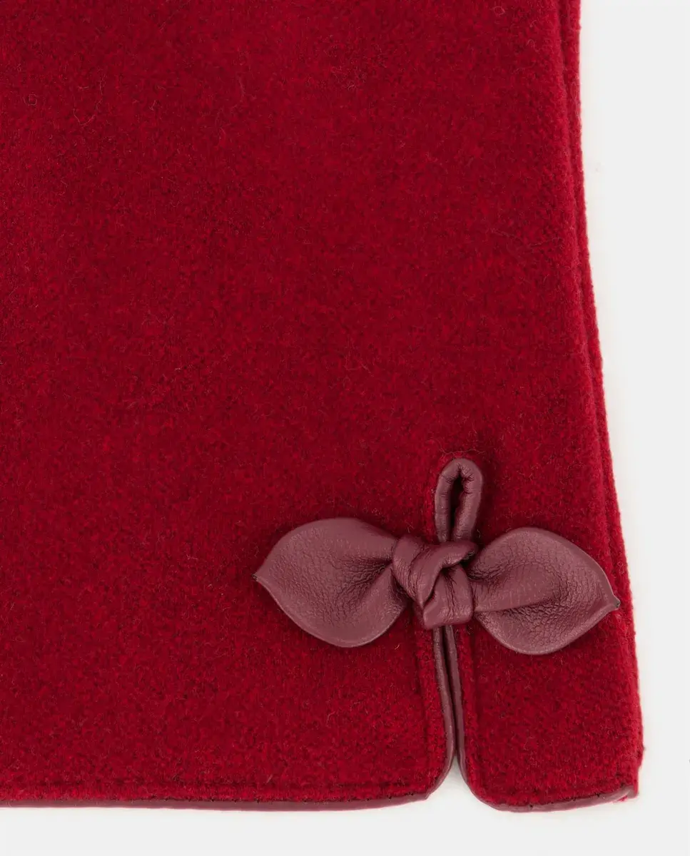 Вязаная перчатка из мягкой пряжи красного цвета с подкладкой и деталью в виде банта, с открытием на манжете.